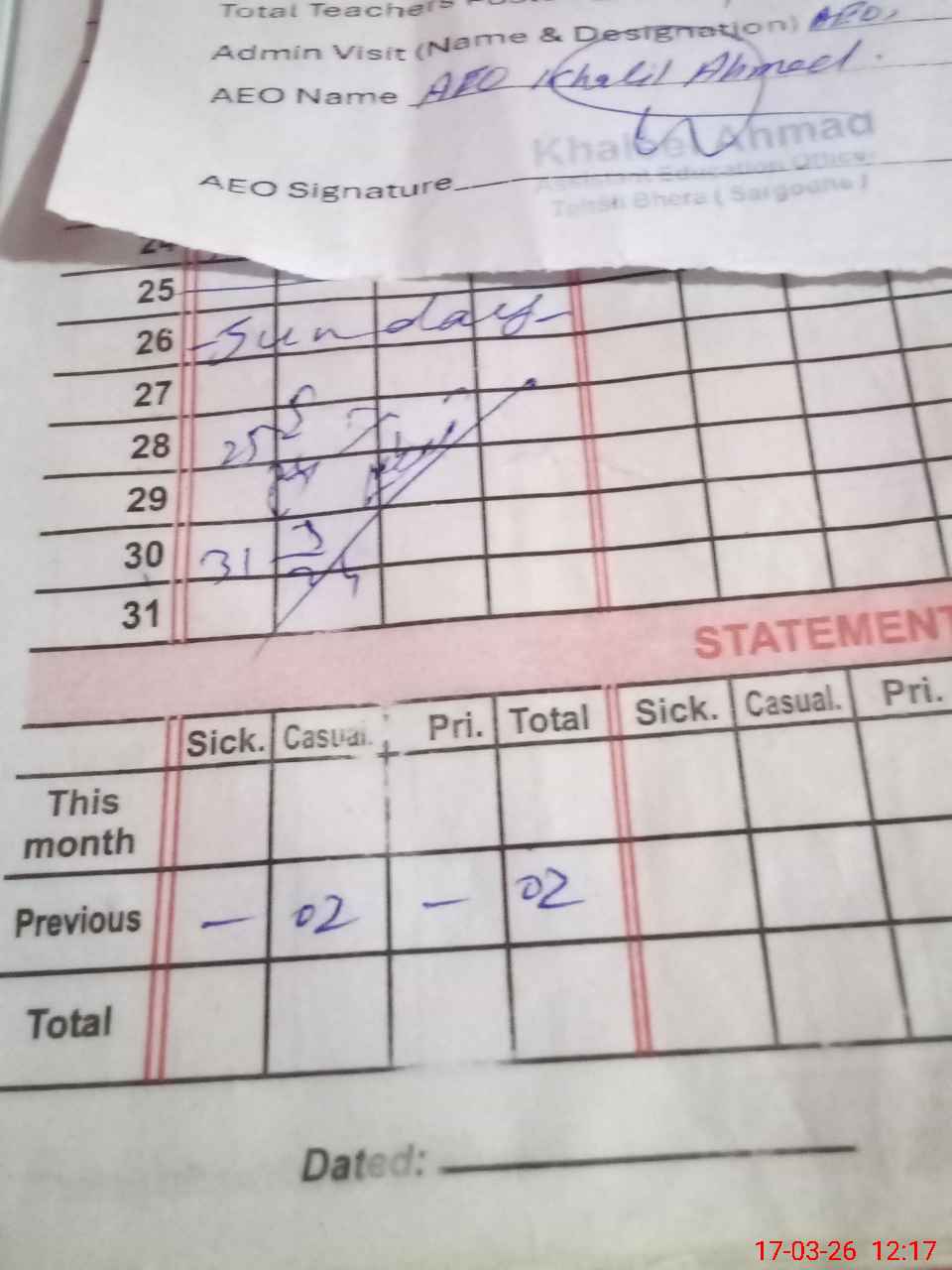 | CNIC | Full Name | Designation | R/C | Absence During Last Calender Month |