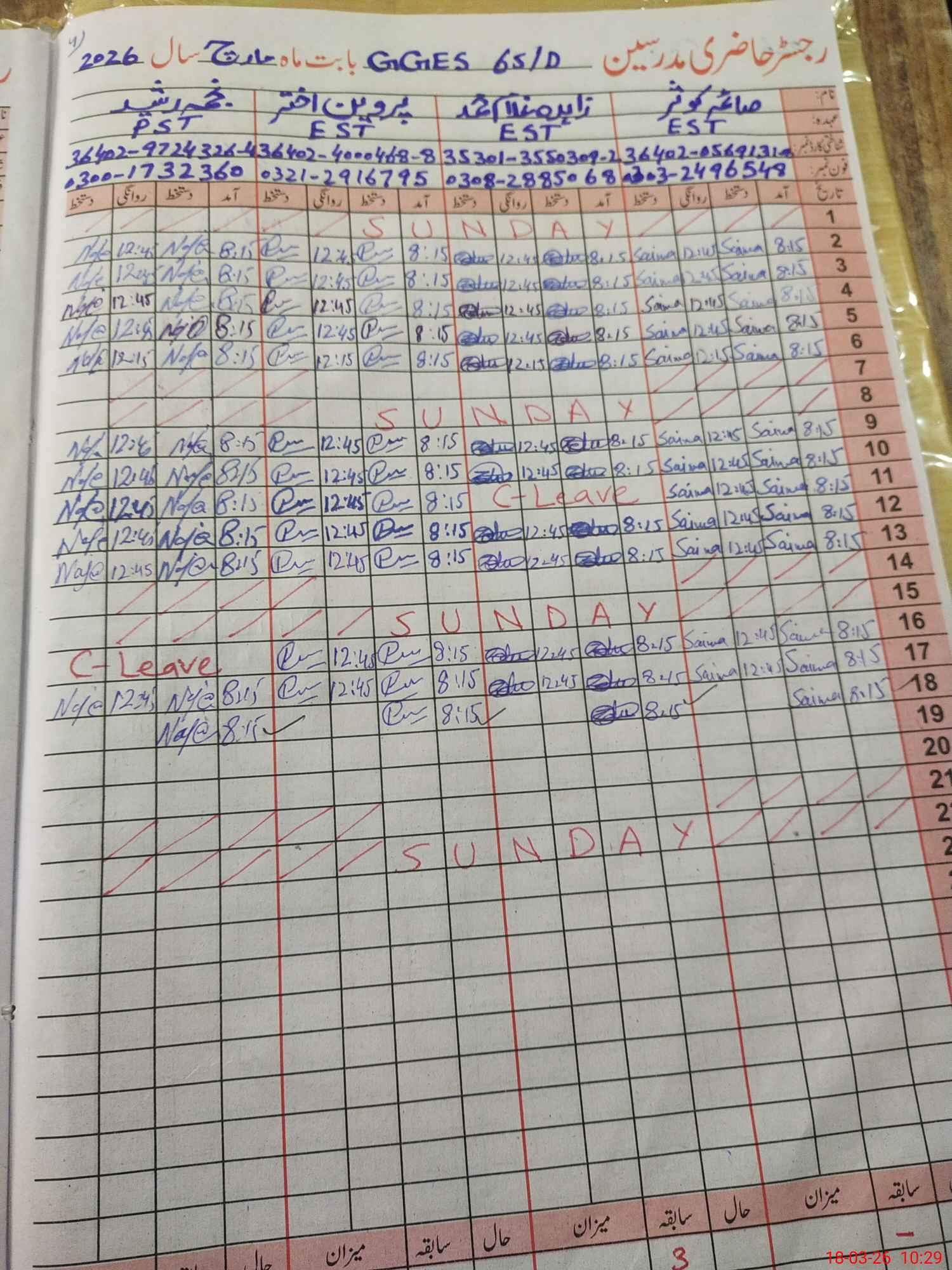 | CNIC | Full Name | Designation | R/C | Absence During Last Calender Month |