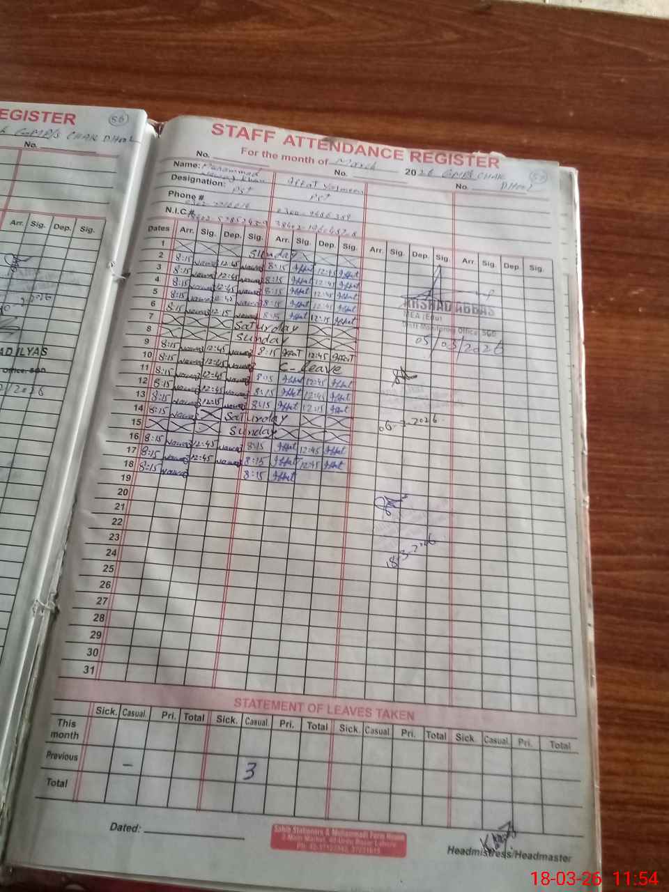 | CNIC | Full Name | Designation | R/C | Absence During Last Calender Month |