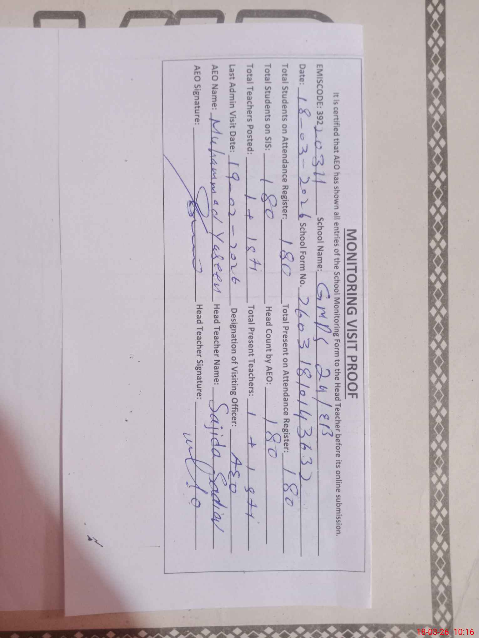 | Certified that this School was Inspected by the Undersigned MEA/DMO Today and the Information Stated Above is as Per Record. | |||||