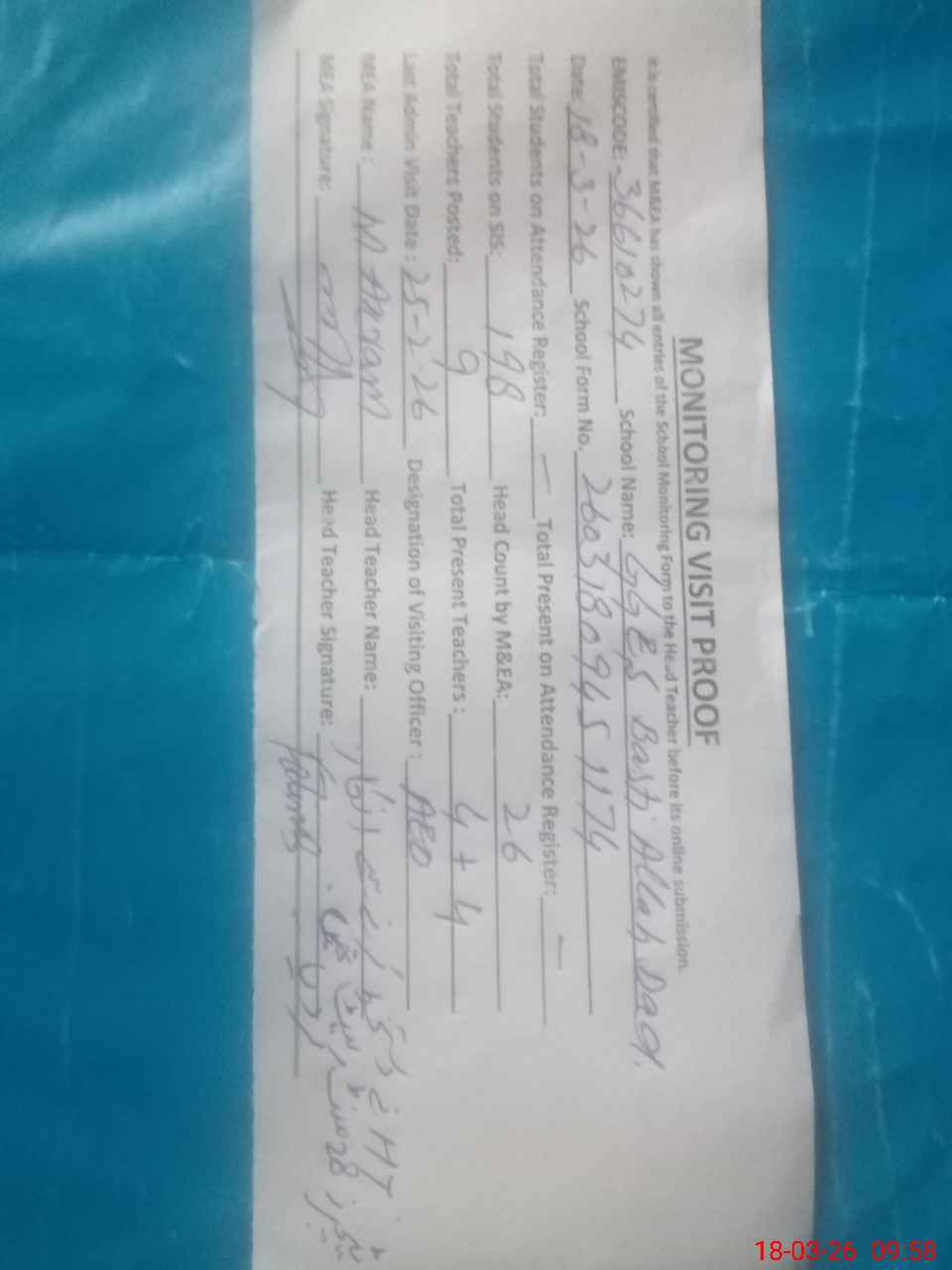 | Attendance Register | Head Teacher | MEA with School | Visit Proof |