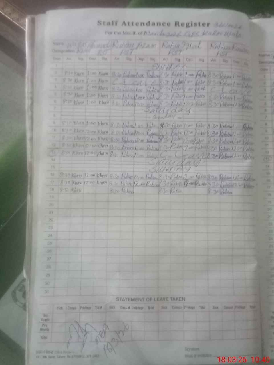 | Leave | Duty | Absent | Maternity | Medical | Ex- Pak |