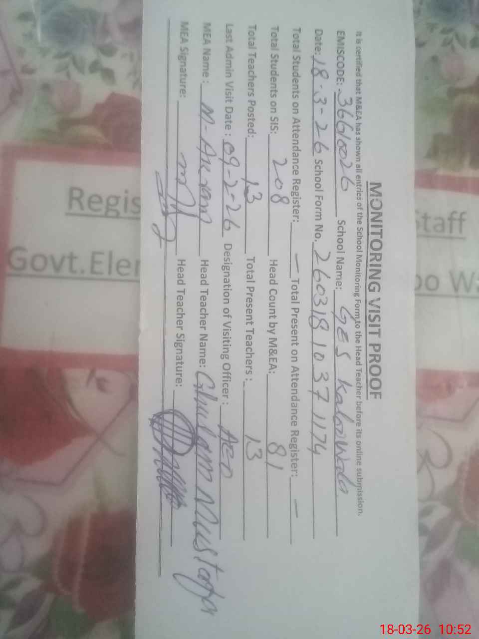 | Attendance Register | Head Teacher | MEA with School | Visit Proof |