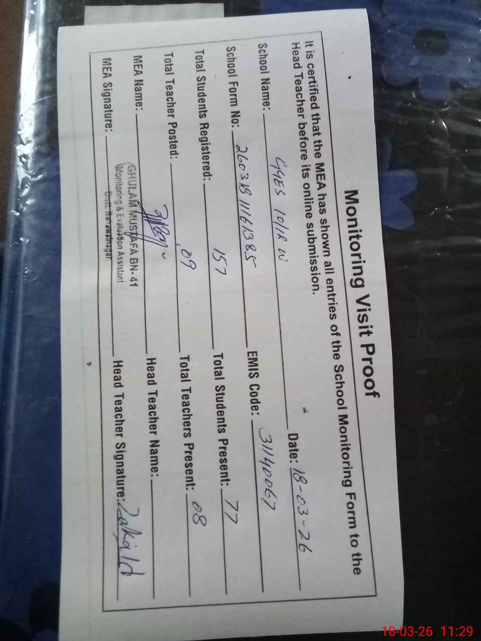 | Attendance Register | Head Teacher | MEA with School | Visit Proof |