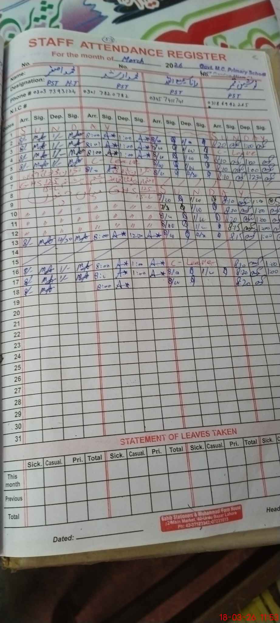 | Name: M.As**** Designation: (School Headmaster's/Headmistress's) PST Phone/Cell Number: 03**** |