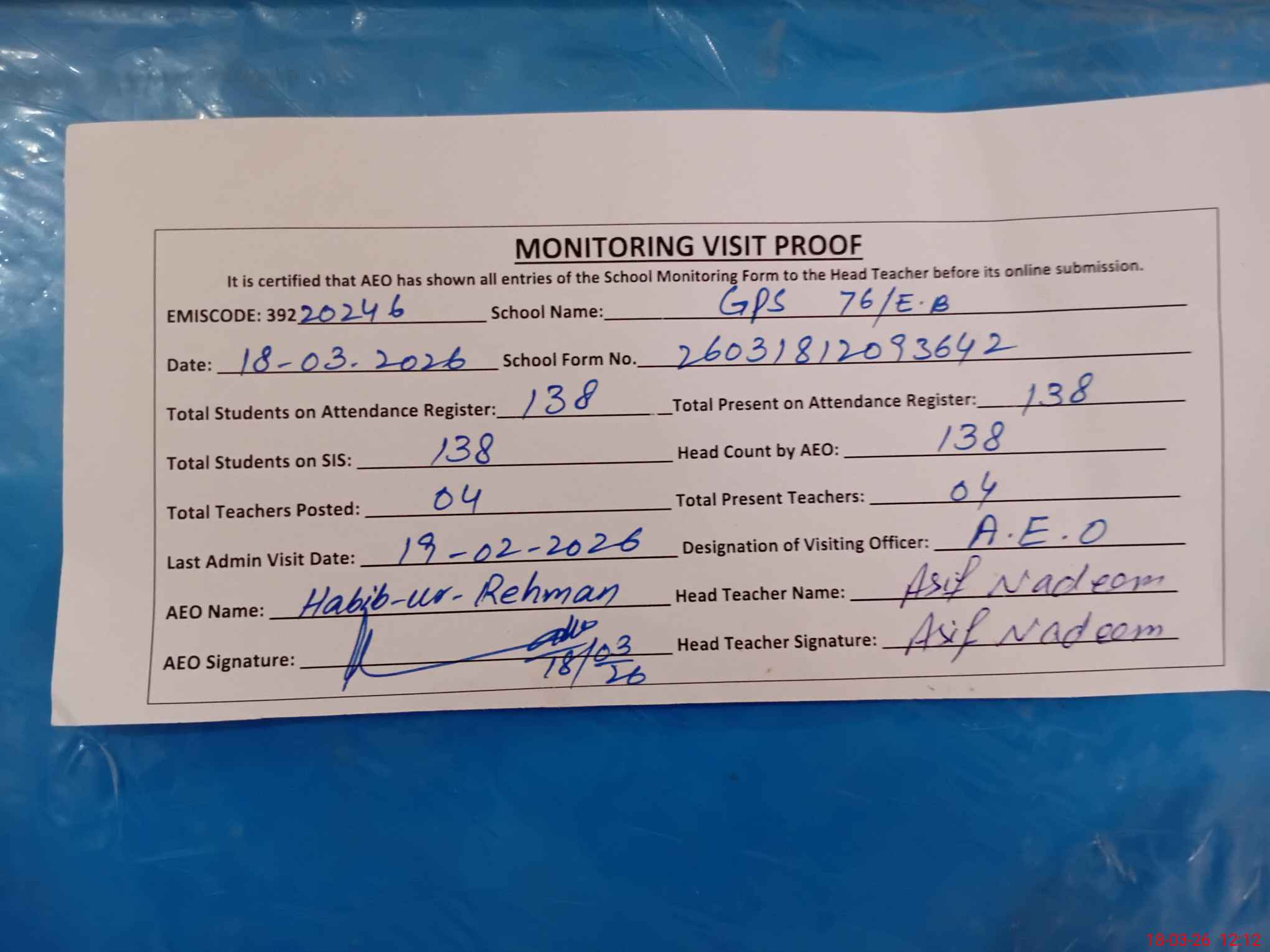 | Attendance Register | Head Teacher | MEA with School | Visit Proof |