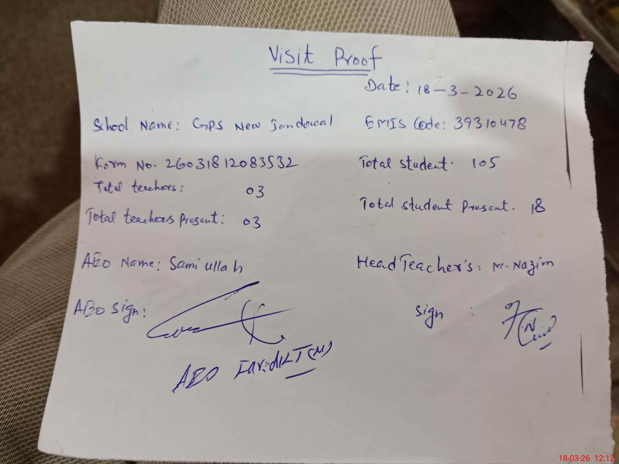 | Attendance Register | Head Teacher | MEA with School | Visit Proof |