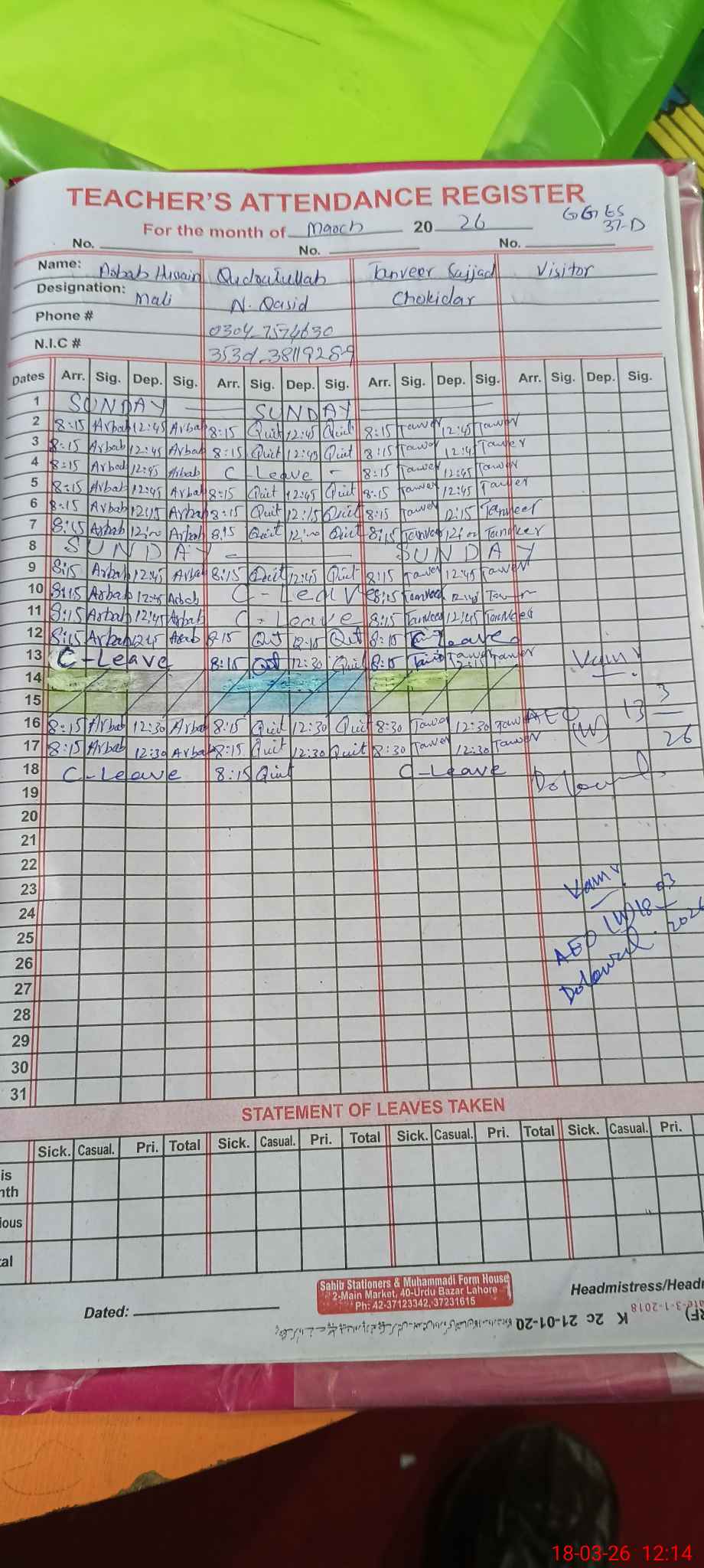 | CNIC | Full Name | Designation | R/C | Absence During Last Calender Month |