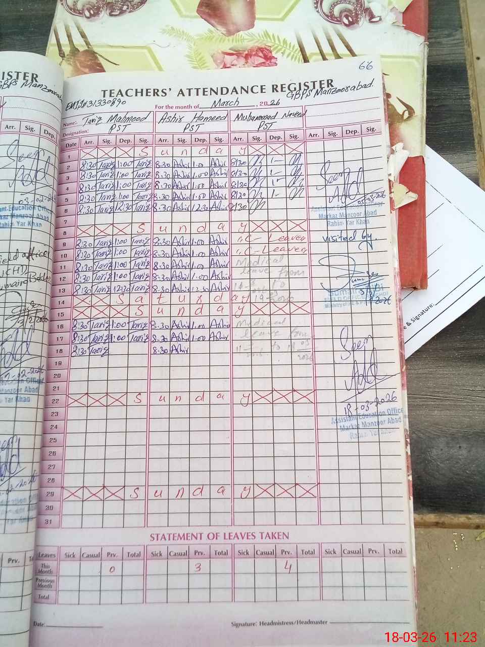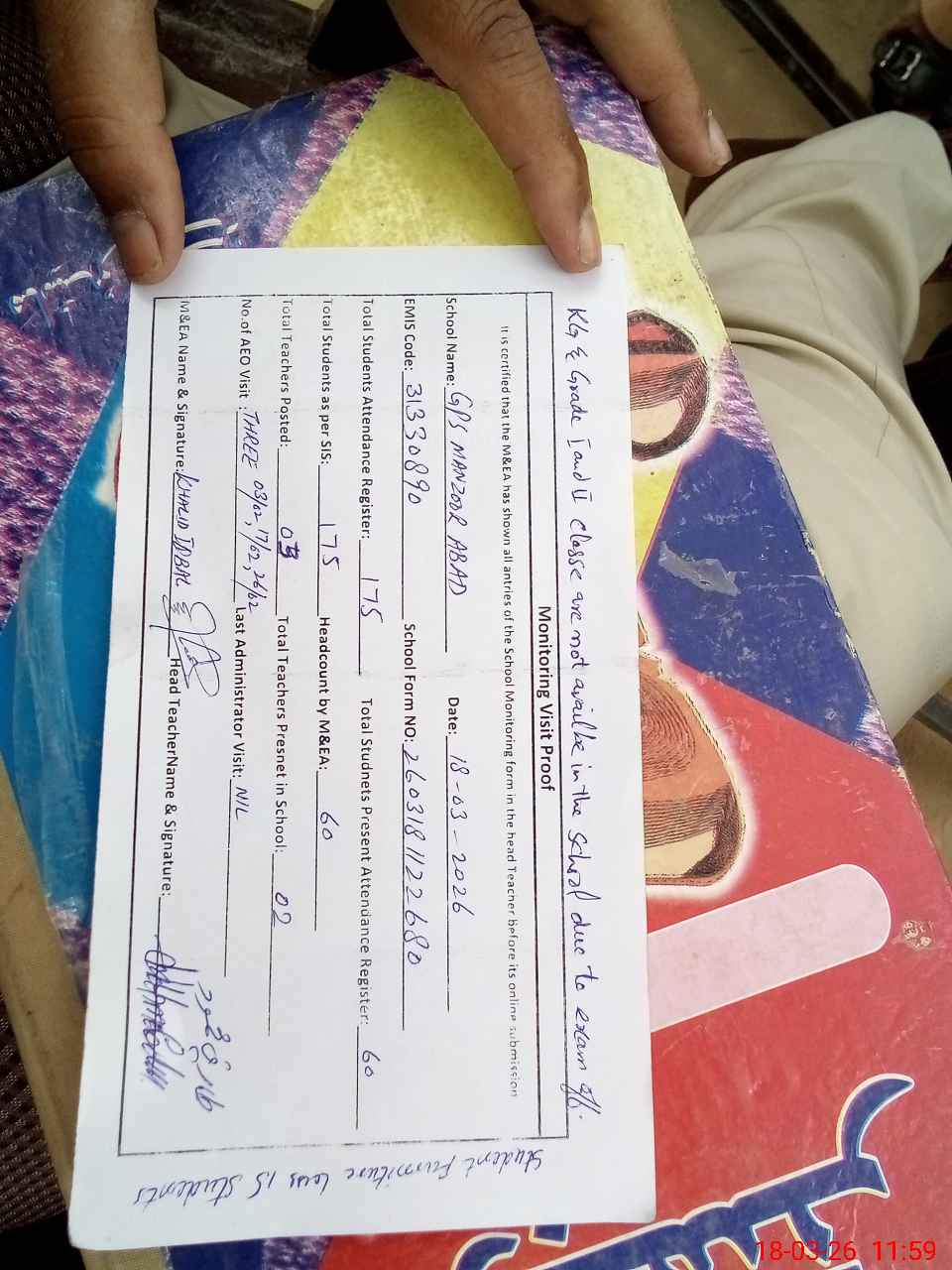 | Remarks (Use Separate Page if Required): KG and Grade 1, 2 are not available in the school due to exam off and teacher Waseem Raja 3130331494051 expired on 15 august 2025 | |||||