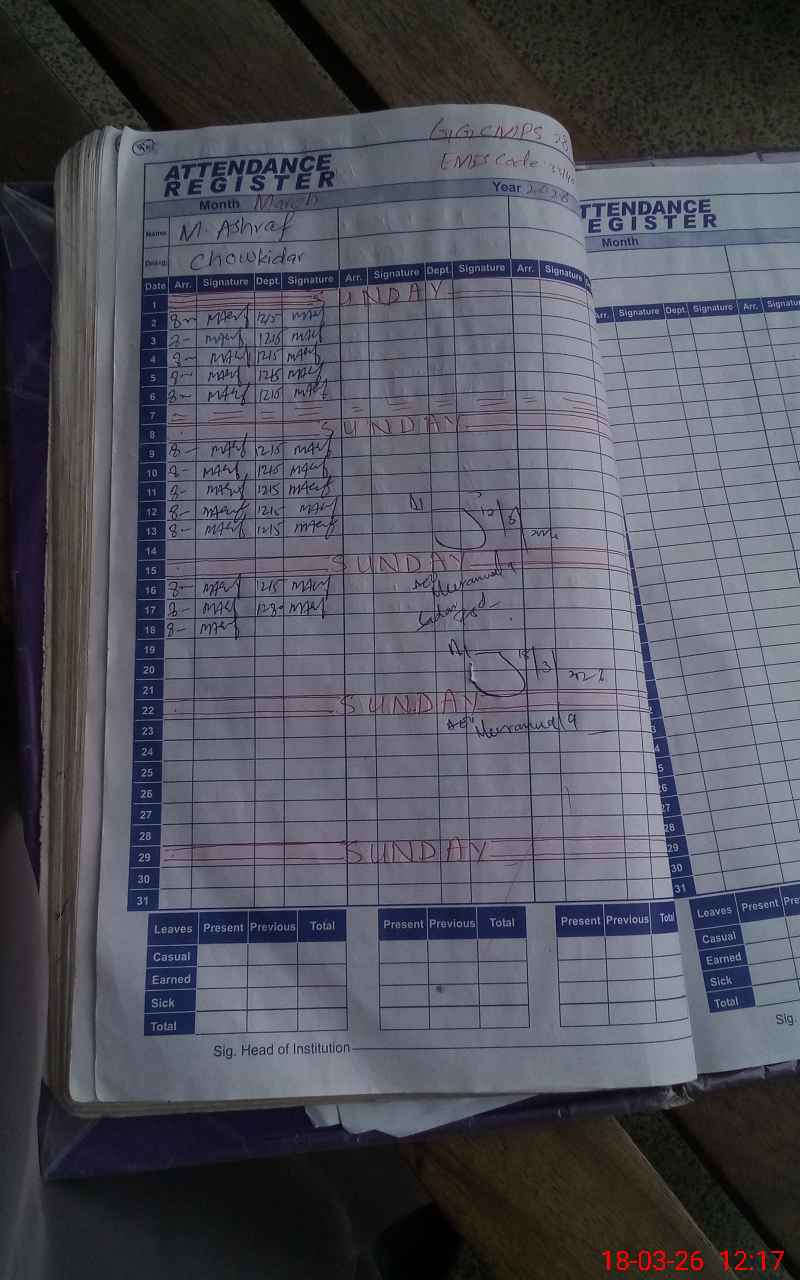 | CNIC | Full Name | Designation | R/C | Absence During Last Calender Month |