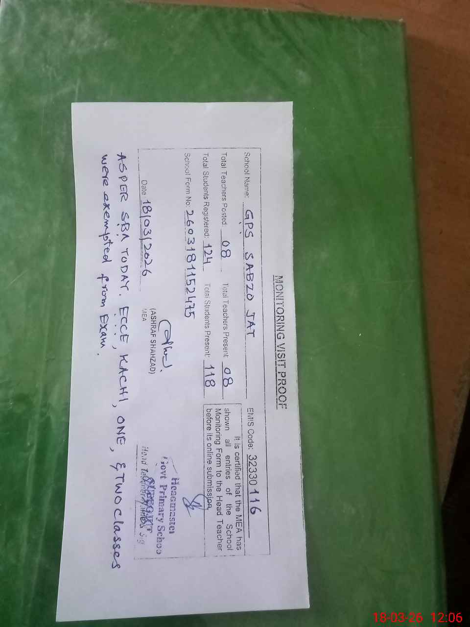 | Remarks (Use Separate Page if Required): As per SBA ECCE, Kachi, One and Two Classes were exempted from exam NSB Record not maintained in school tab | |||||
