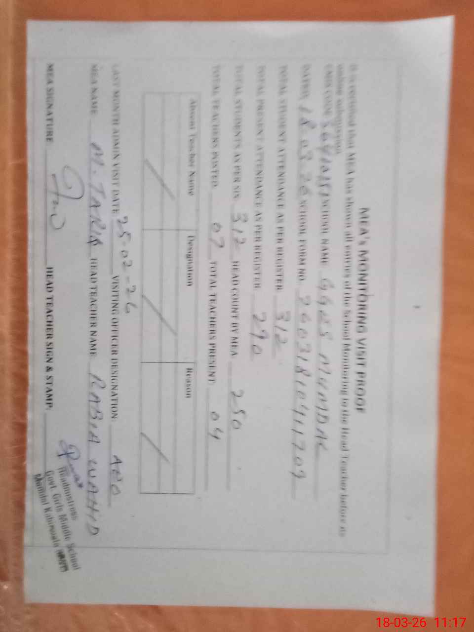 | Attendance Register | Head Teacher | MEA with School | Visit Proof |