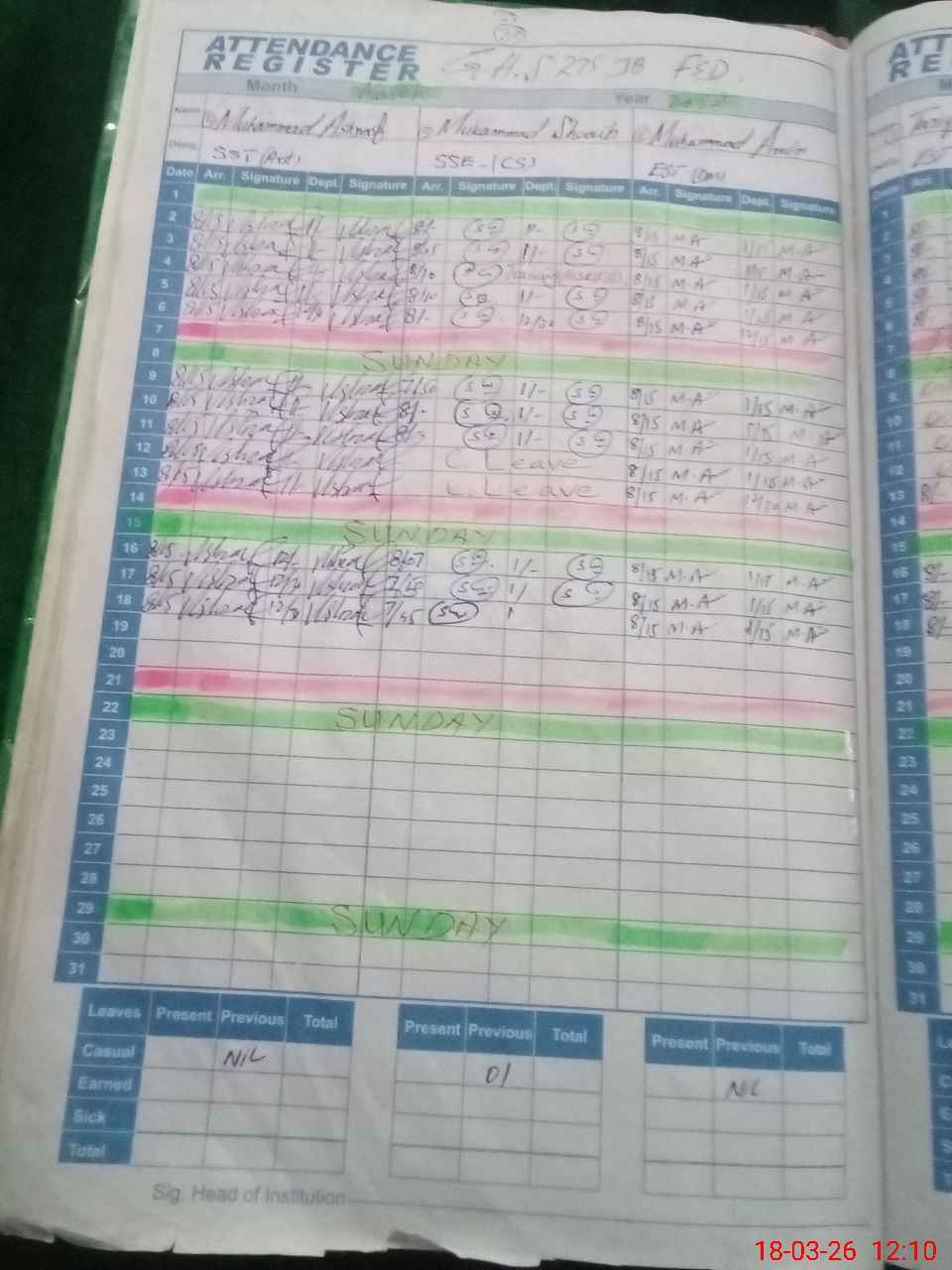 | CNIC | Full Name | Designation | R/C | Absence During Last Calender Month |