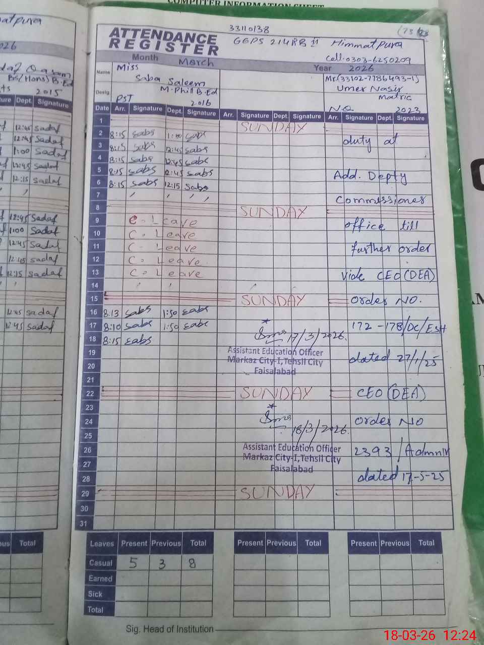 | EMIS Code: 33110138 | Name of School: GGPS CHAK NO 214 RB HIMMAT PURA | |||
