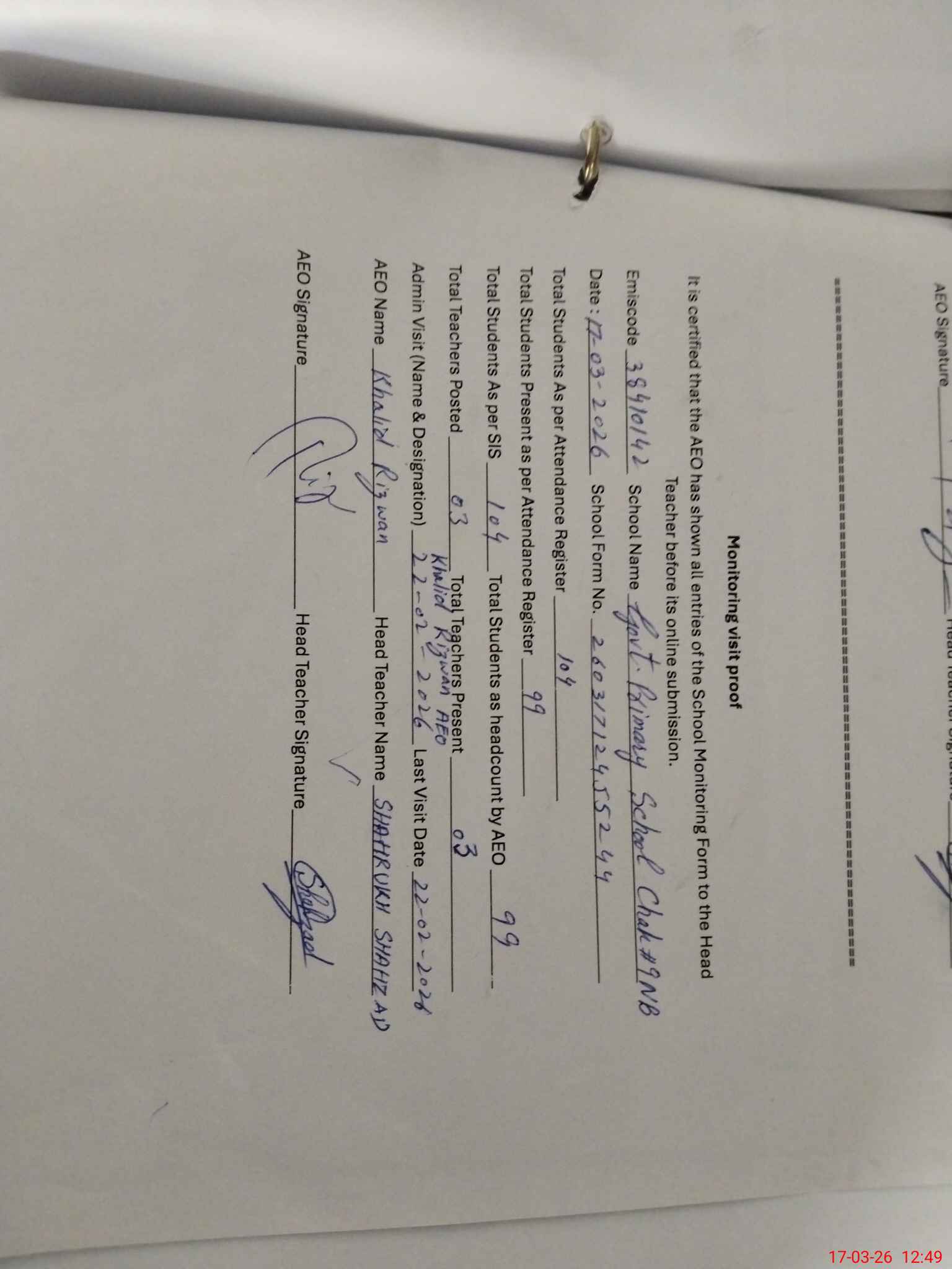 | Certified that this School was Inspected by the Undersigned MEA/DMO Today and the Information Stated Above is as Per Record. | |||||