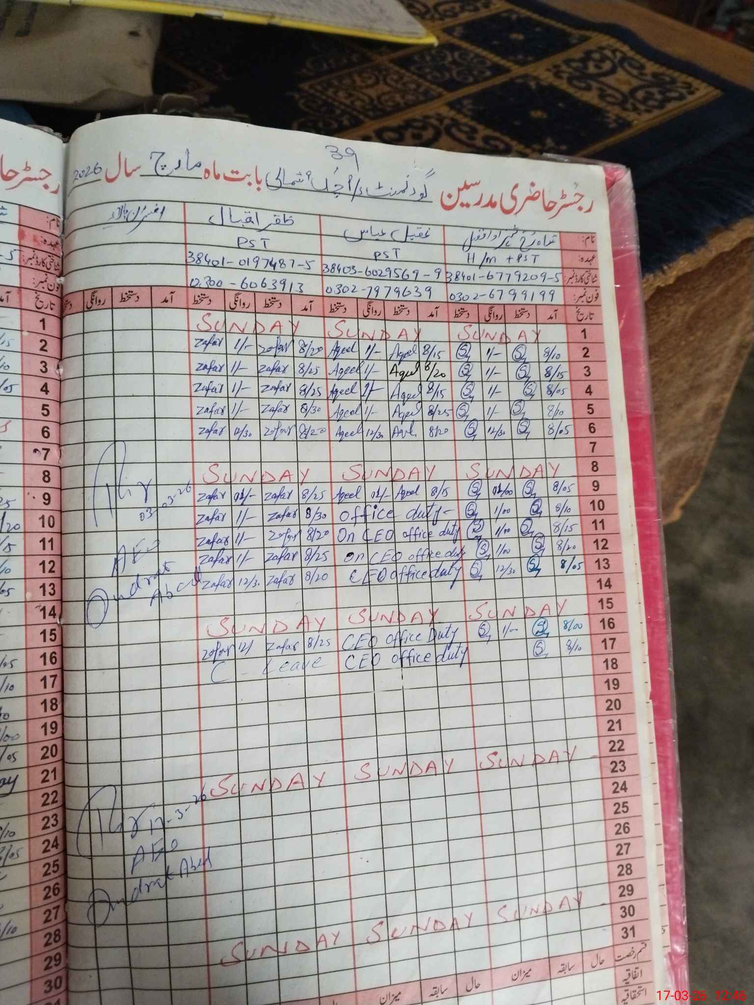 | CNIC | Full Name | Designation | R/C | Absence During Last Calender Month |