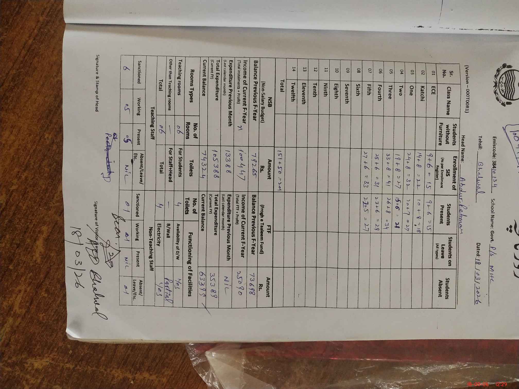 | Total no. of Classrooms: 6 No. of Classrooms Used for Teaching: 6 No. of Classrooms Storing Old Furniture, FTBs, etc: 0Comments if Any: 0 |