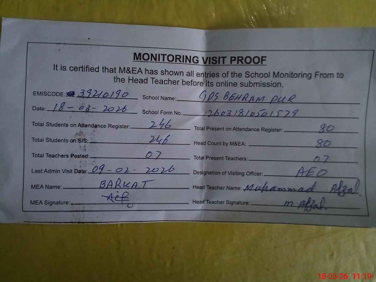 | EMIS Code: 39210190 | Name of School: GPS BEHRAM PUR PO PAKPATTAN | |||