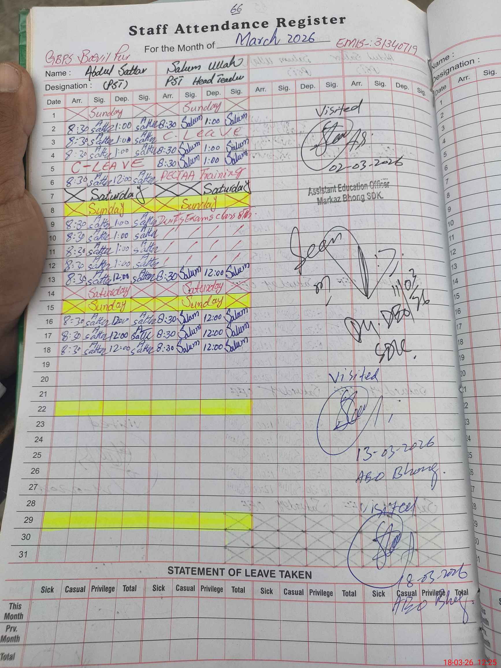 | Name: Sa**** Ul**** Designation: (School Headmaster's/Headmistress's) PST Phone/Cell Number: 03**** |