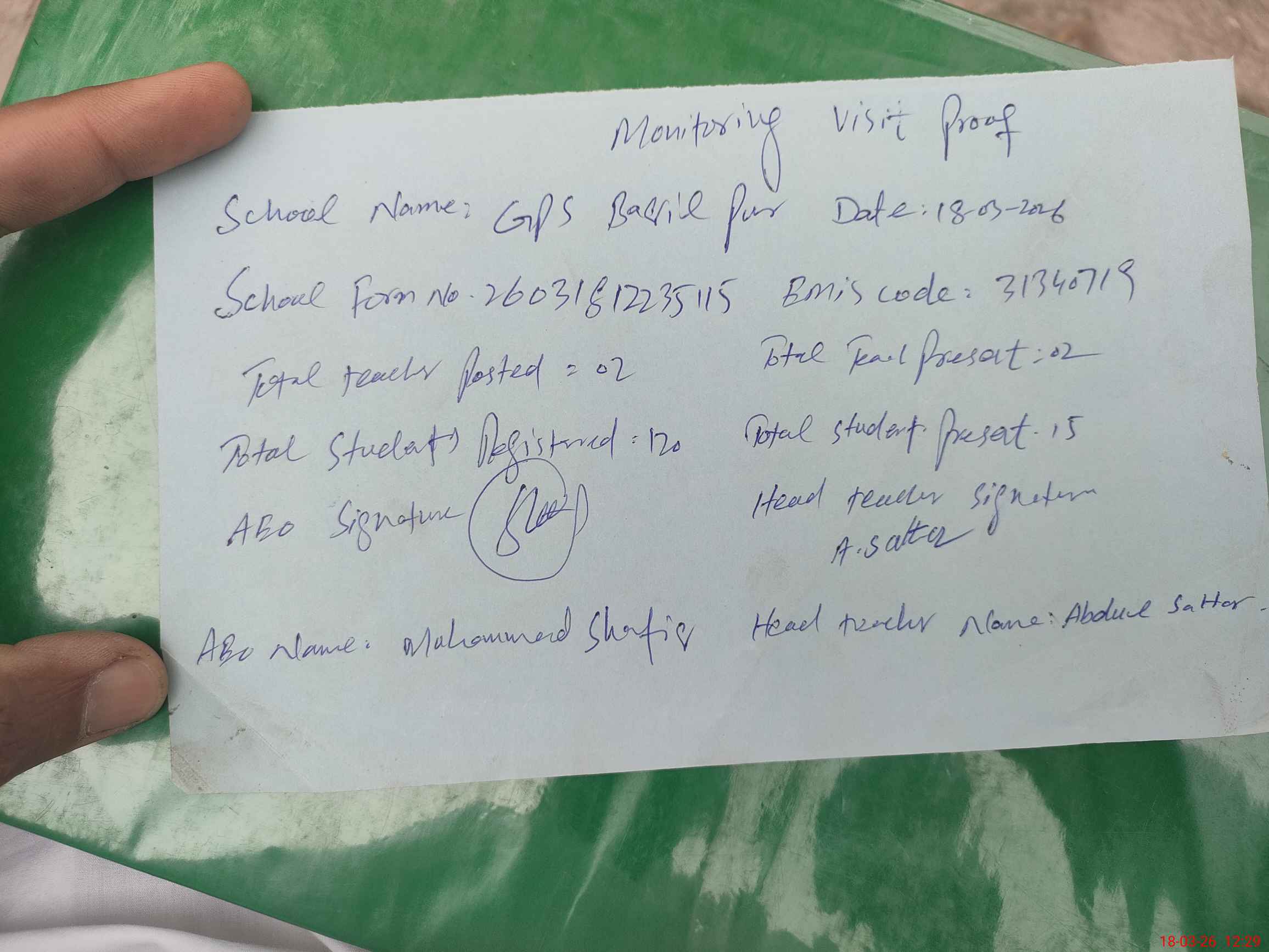 | Attendance Register | Head Teacher | MEA with School | Visit Proof |