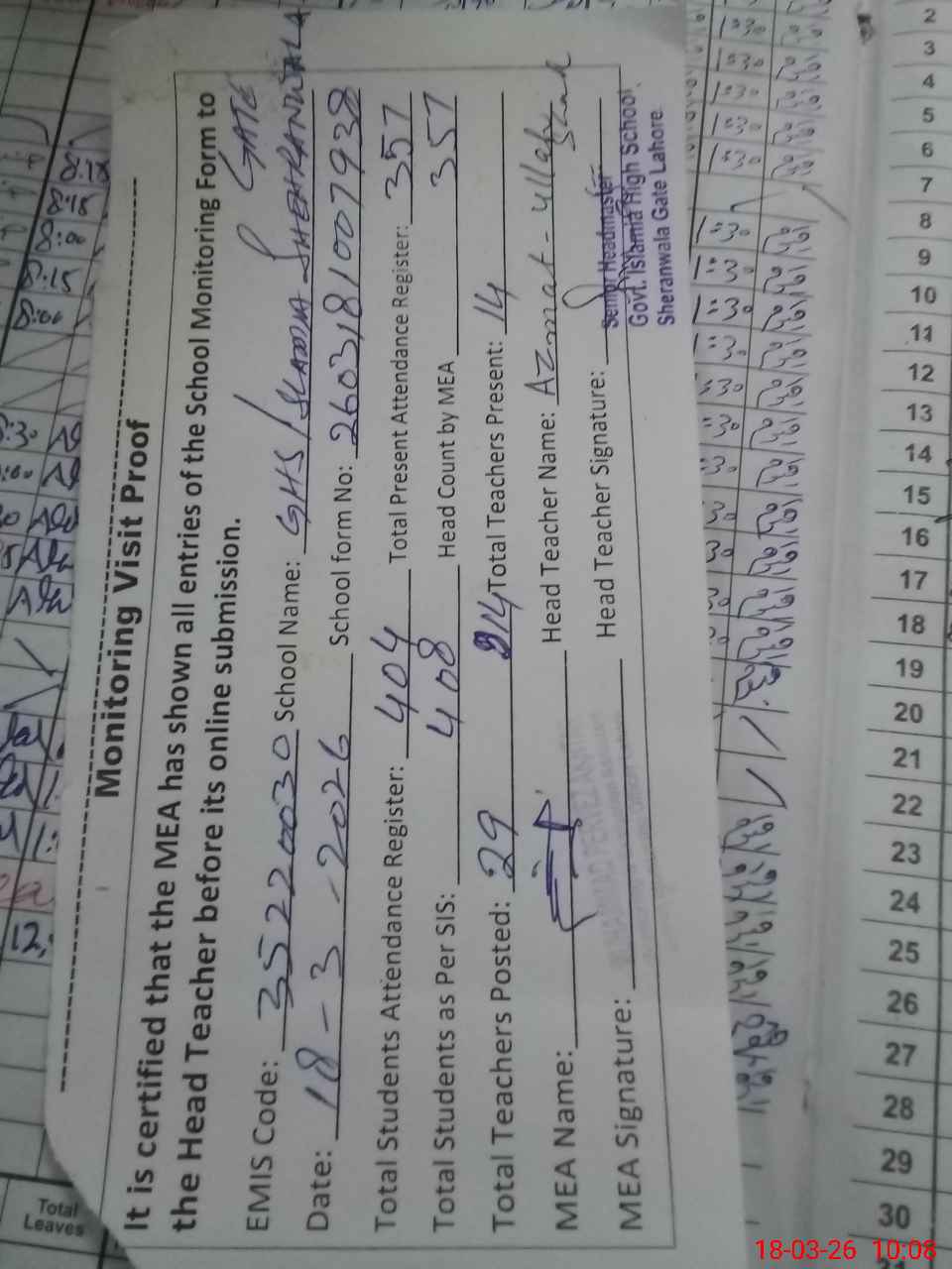 | Attendance Register | Head Teacher | MEA with School | Visit Proof |