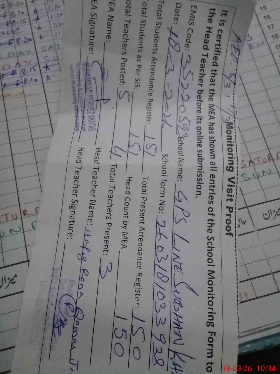 | Attendance Register | Head Teacher | MEA with School | Visit Proof |