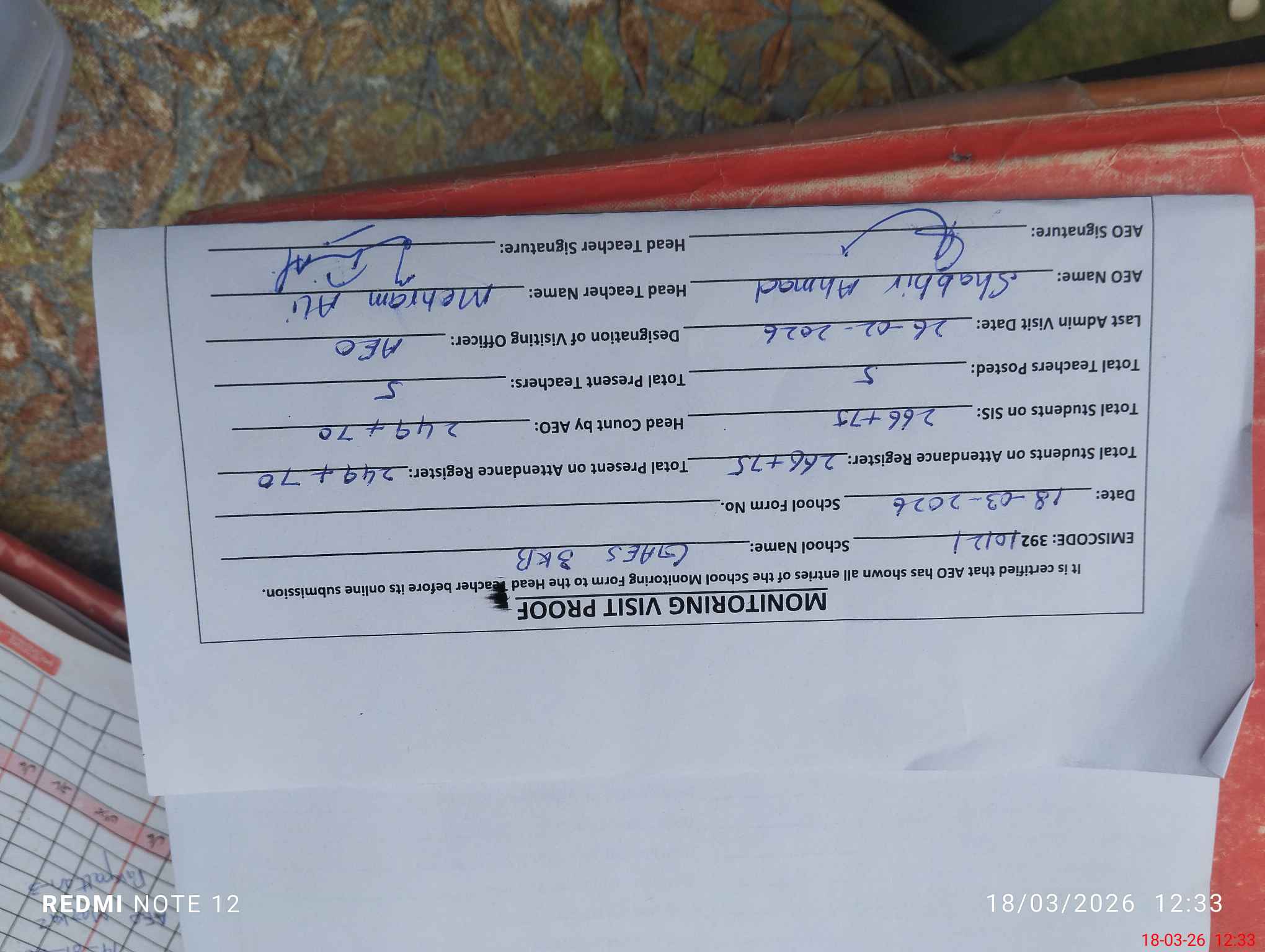 | Attendance Register | Head Teacher | MEA with School | Visit Proof |