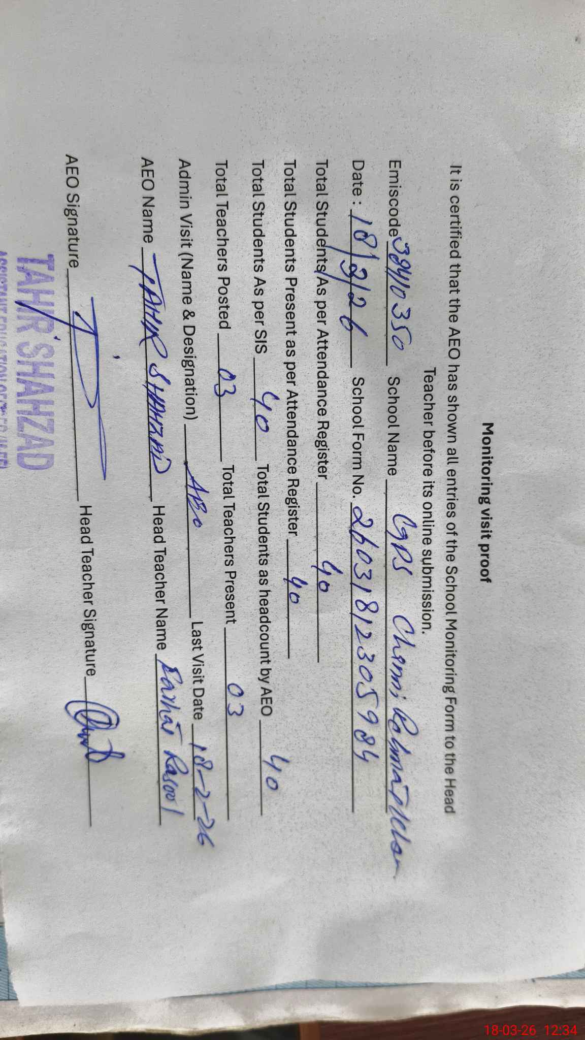 | Attendance Register | Head Teacher | MEA with School | Visit Proof |