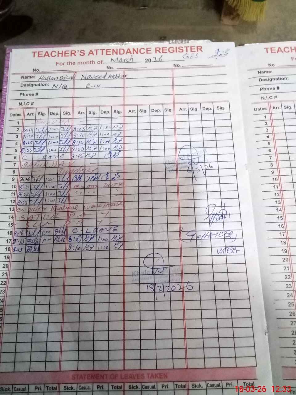 | CNIC | Full Name | Designation | R/C | Absence During Last Calender Month |