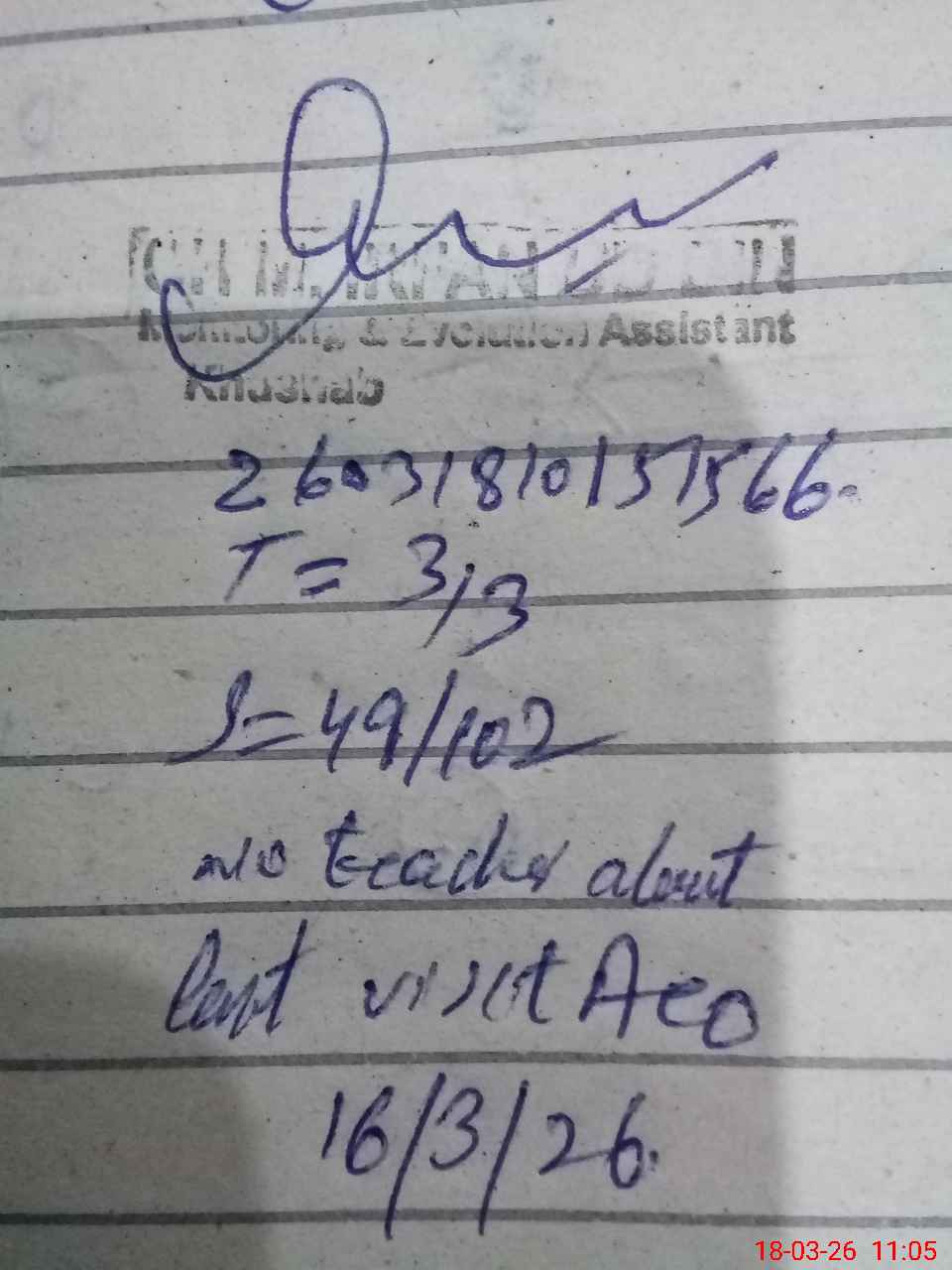 | Remarks (Use Separate Page if Required): gps chuk no 12 mb student on sis 102 student on register 102 head count 49 no teacher absent last visit aeo 16/3/26 ece and nursery classes are suspended due to war situation in country | |||||
