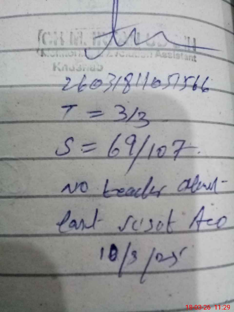 | Remarks (Use Separate Page if Required): gps chuk no 7 mb student on sis 107 student on register 107 head count 69 no teacher absent last visit aeo 10/3/26 class room required teaching staff required | |||||