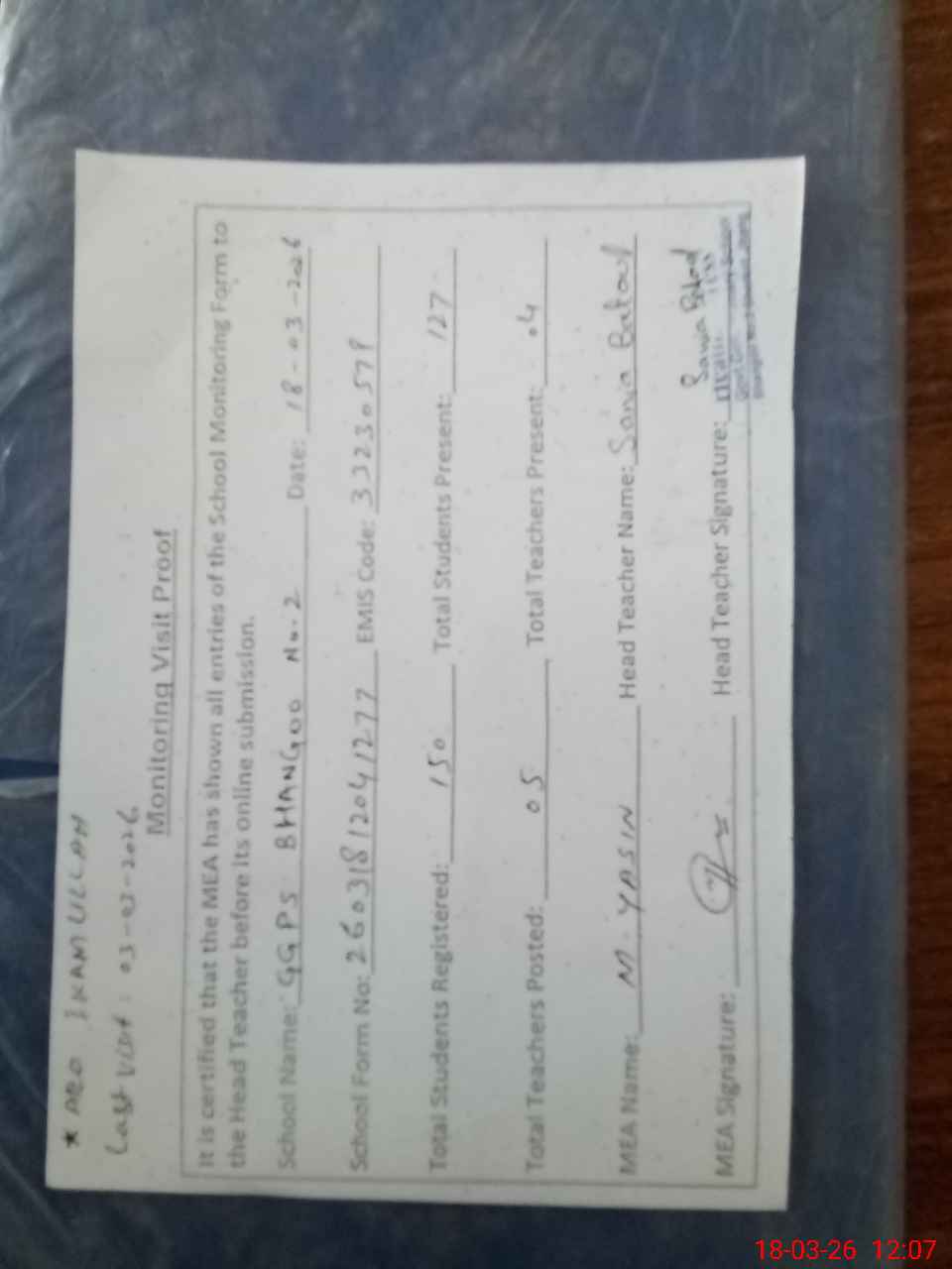 | Attendance Register | Head Teacher | MEA with School | Visit Proof |