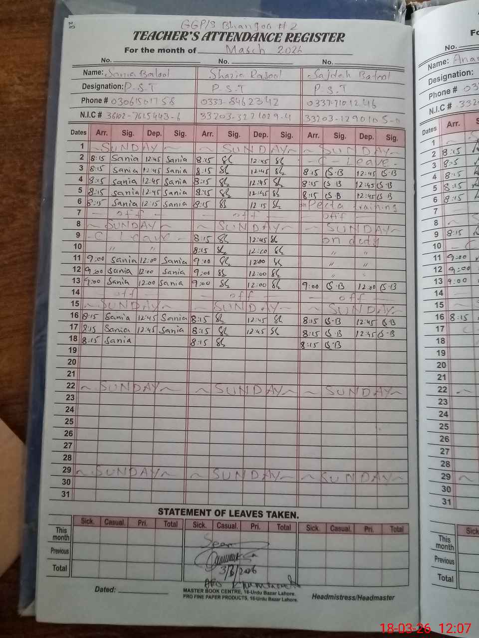 | Name: SA**** BA**** Designation: (School Headmaster's/Headmistress's) PST Phone/Cell Number: 03**** |