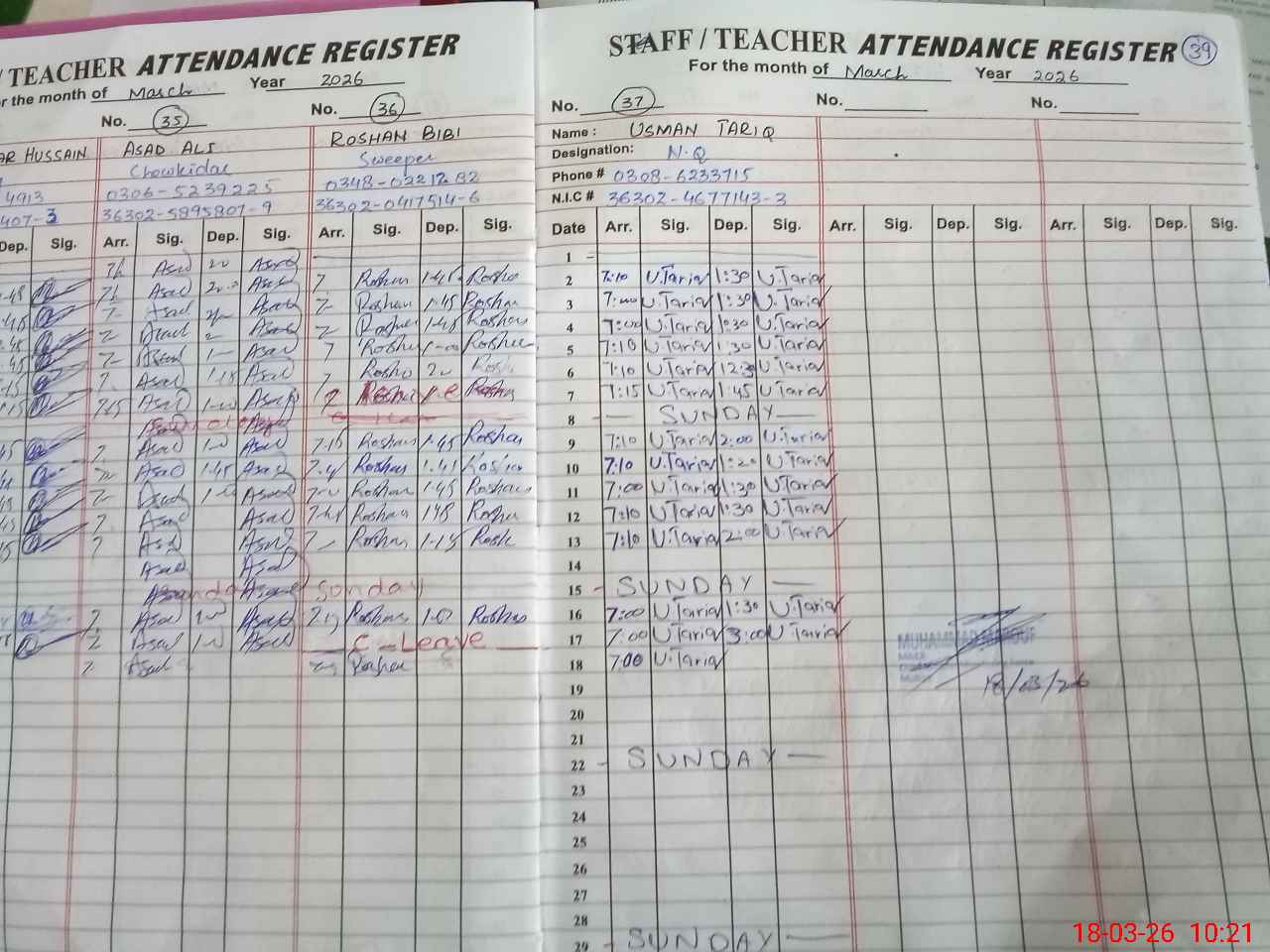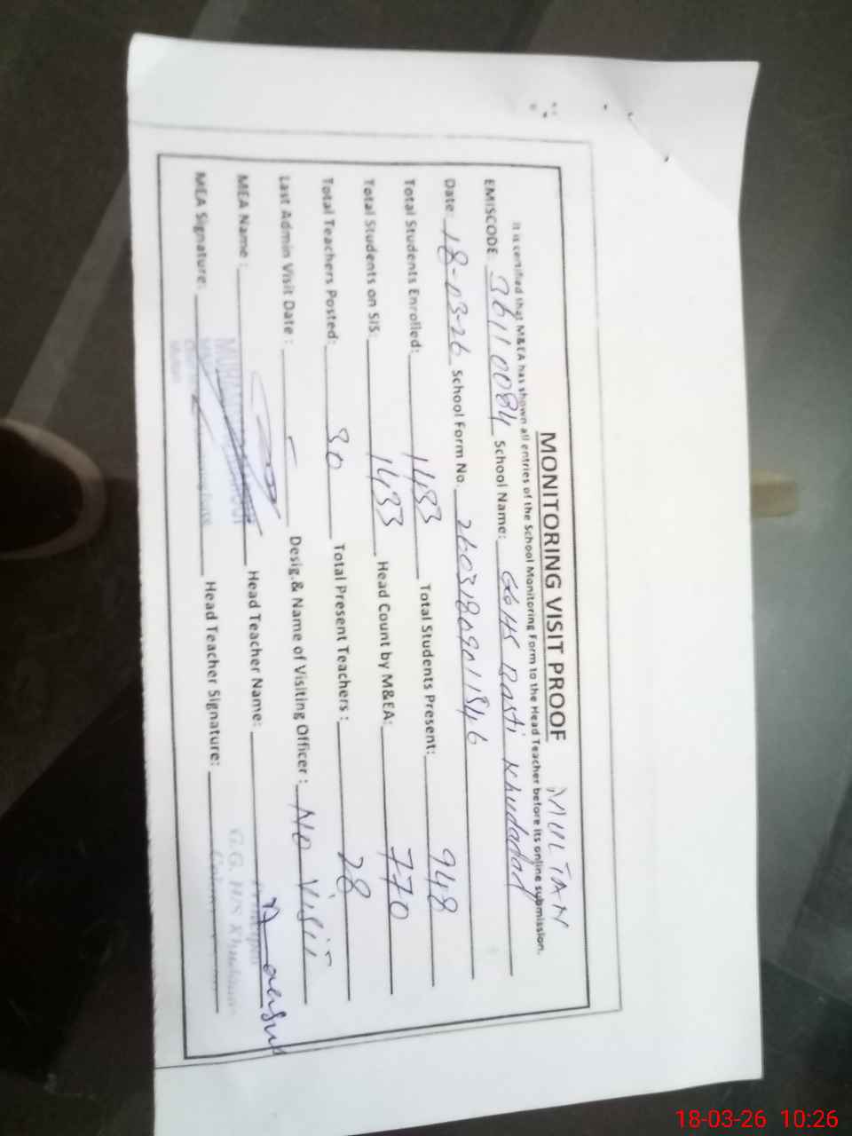 | Remarks (Use Separate Page if Required): PST munaza BATOOL mentioned casual leave on attendance rejister but no sanctioned leave record provided marked as absent Rosenamcha not written on 17th and 18th Mar 26 Nursary Grade 1 2 and 10 at off Grade 3 to Grade 9 students presence 770 out of 1000 hygiene condition worst dirty toilets and no soap placed on Wash basins | |||||