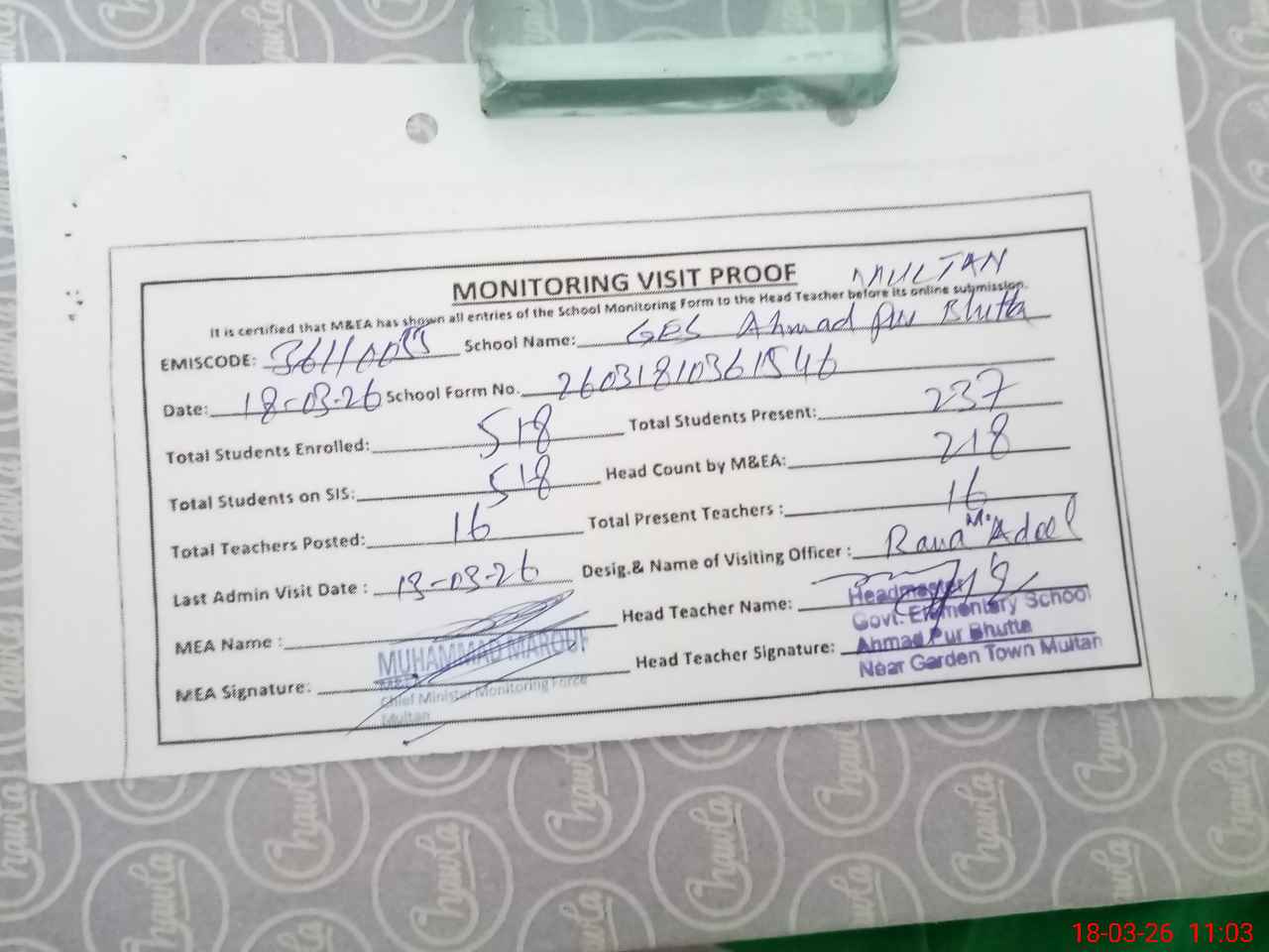 | Attendance Register | Head Teacher | MEA with School | Visit Proof |