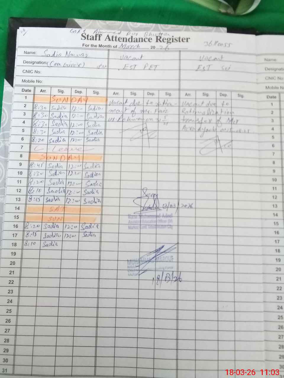 | Name: TA**** SH**** Designation: (School Headmaster's/Headmistress's) Sst Sc Phone/Cell Number: 03**** |
