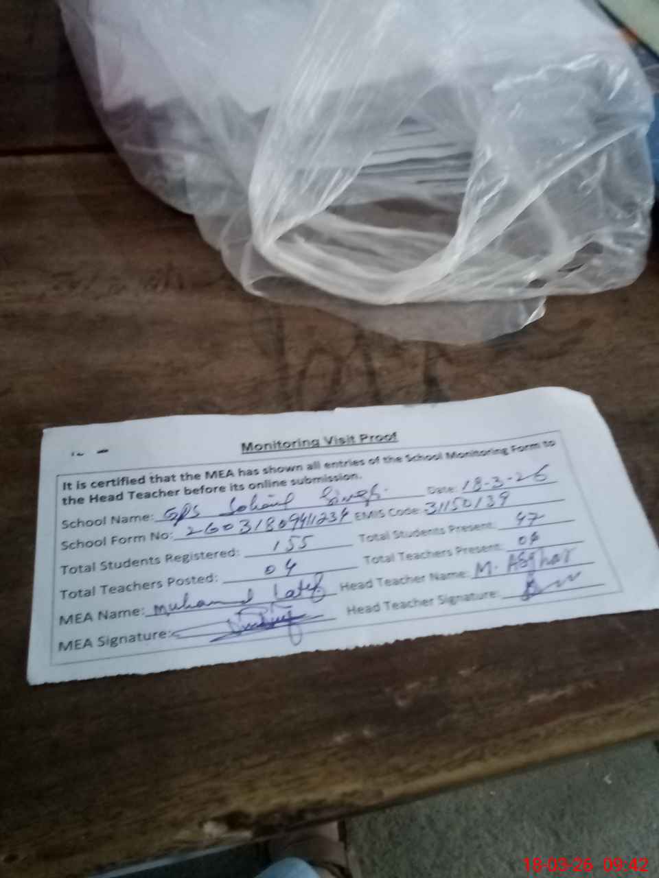 | Attendance Register | Head Teacher | MEA with School | Visit Proof |