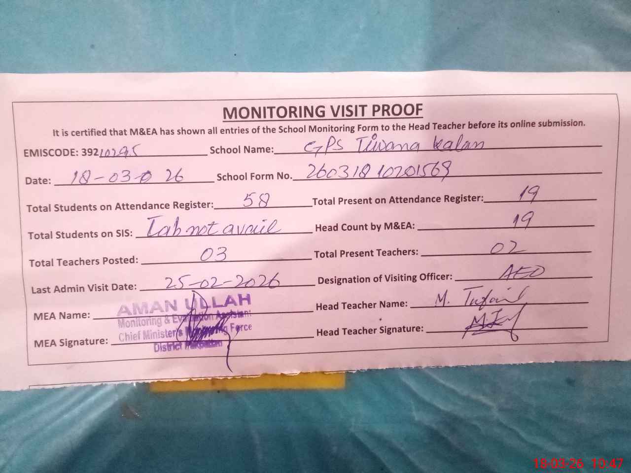 | Attendance Register | Head Teacher | MEA with School | Visit Proof |