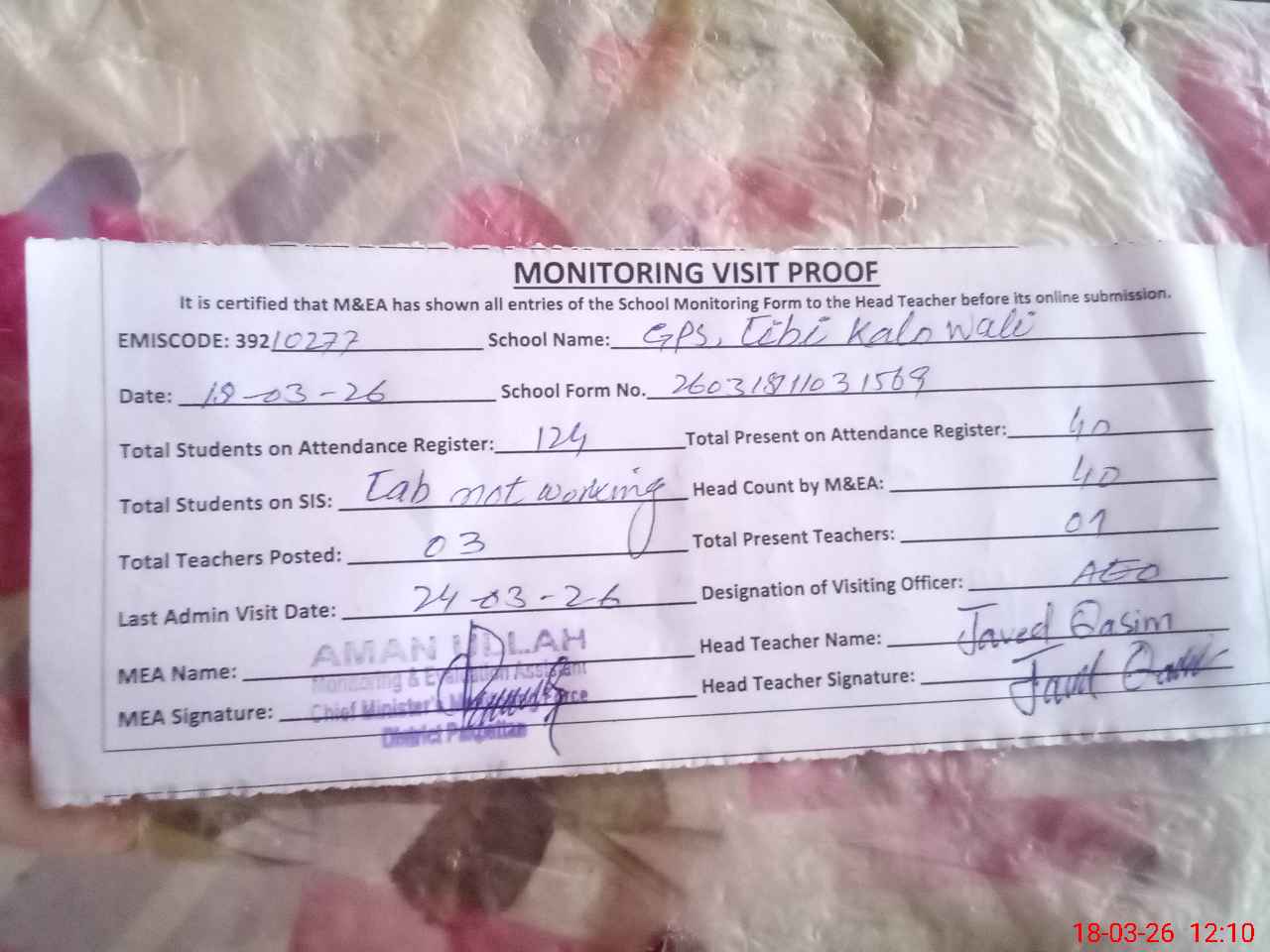 | Remarks (Use Separate Page if Required): FTF not collect by the students narsary class off class one two not SBA class three four five SBA progress at school | |||||