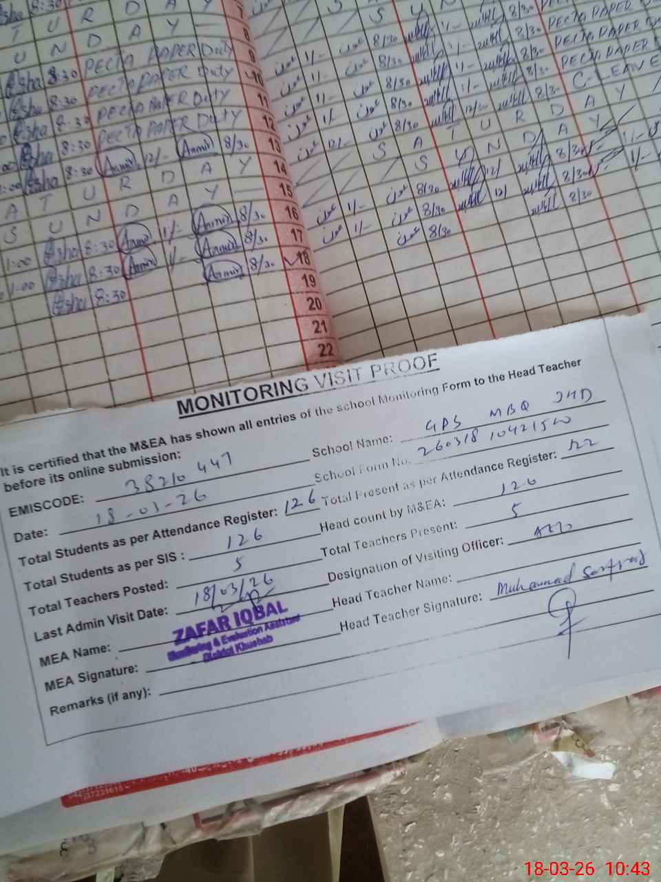 | Remarks (Use Separate Page if Required): last visit AEO 18 Mar 26 Total on register 126 Total on sis 126 | |||||