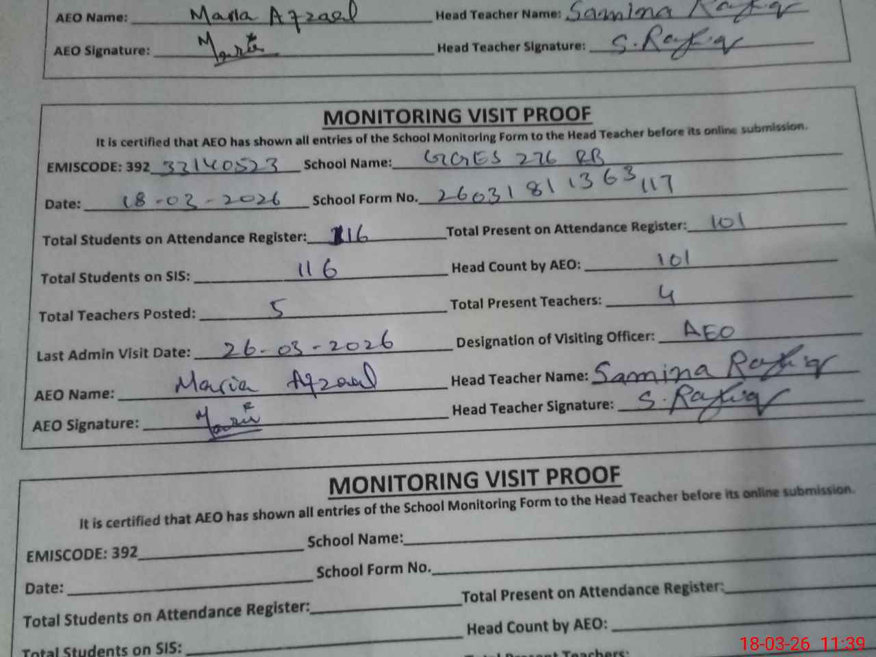 | Attendance Register | Head Teacher | MEA with School | Visit Proof |