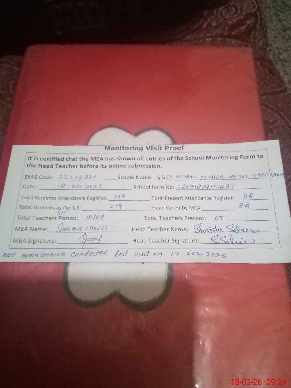 | Attendance Register | Head Teacher | MEA with School | Visit Proof |
