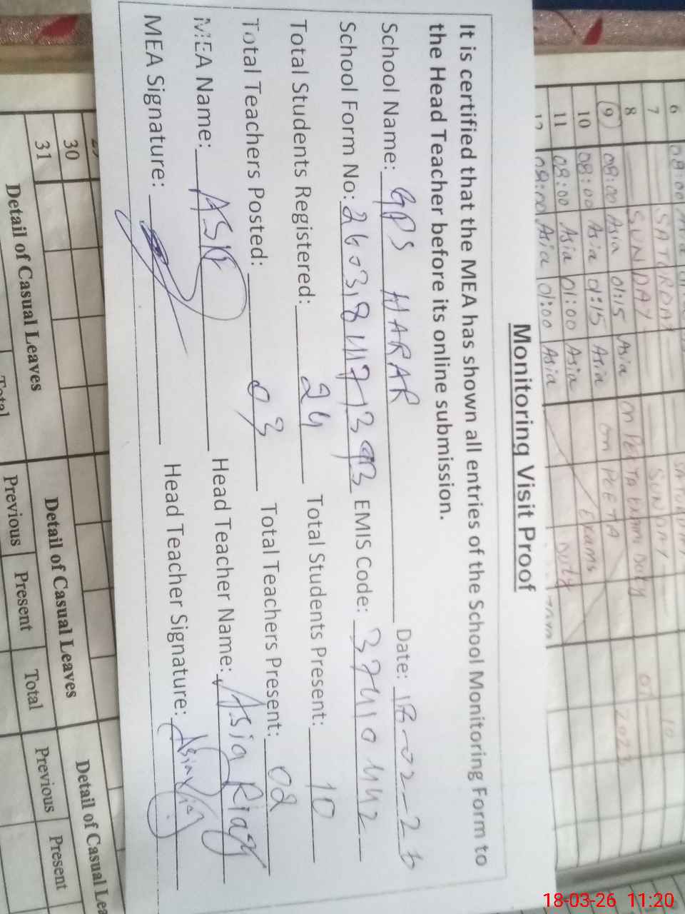 | Attendance Register | Head Teacher | MEA with School | Visit Proof |