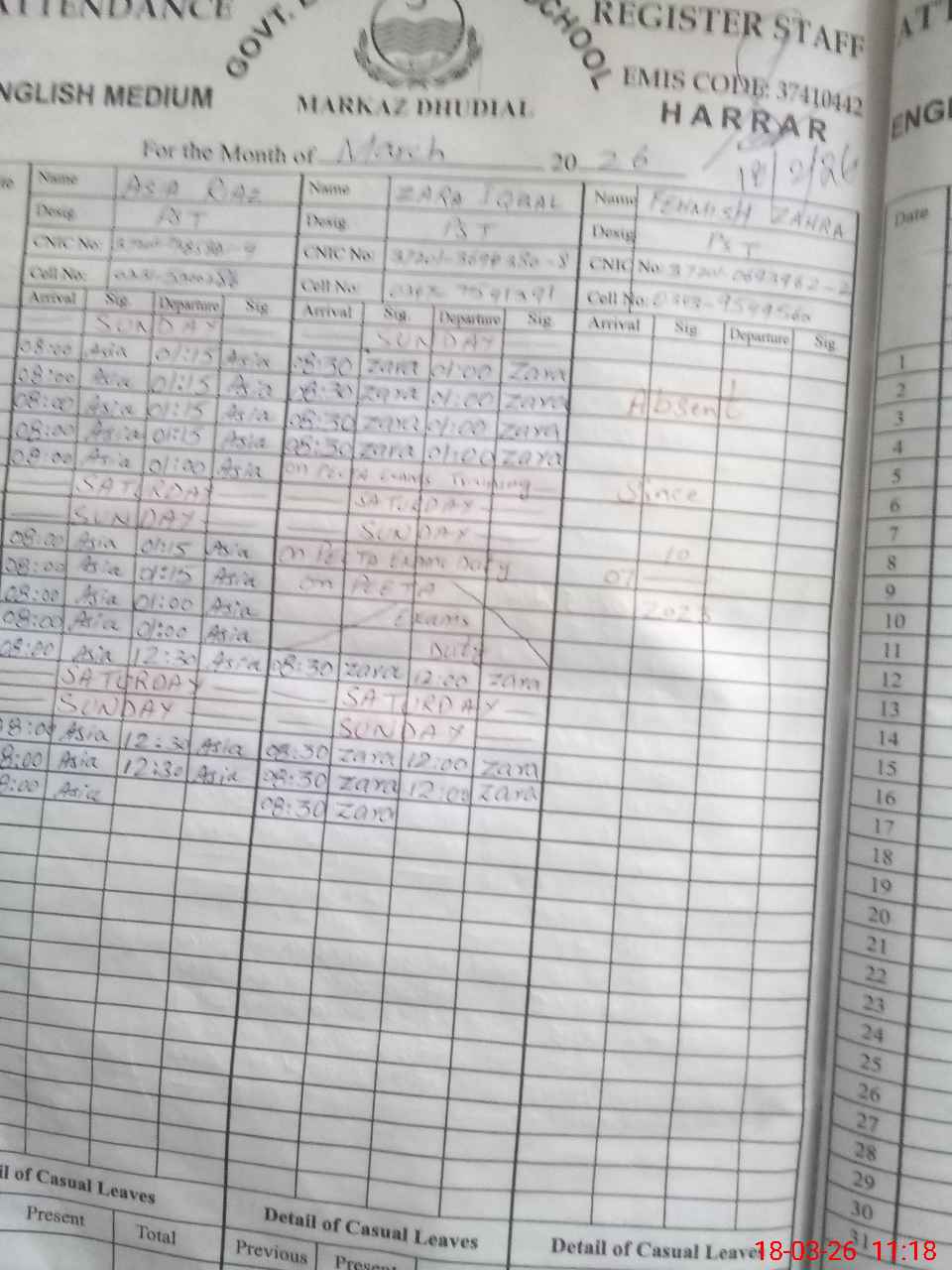 | 37**** | Fe**** Za**** | PST Science/Maths | Regular | 0 | 0 | 28 | 0 | 0 | 0 | 0 | 0 | 0 | Absent (Un-Authorized) |