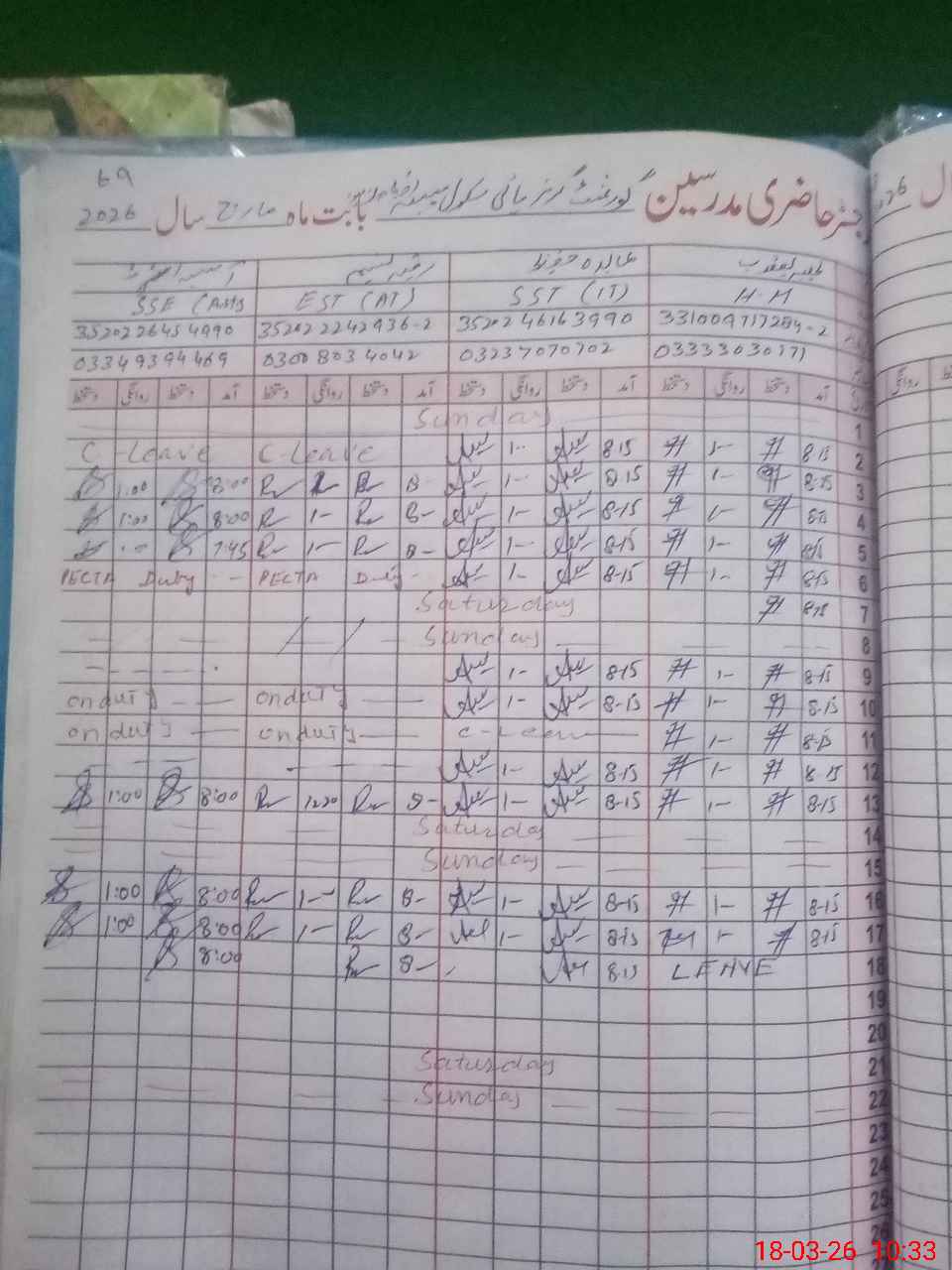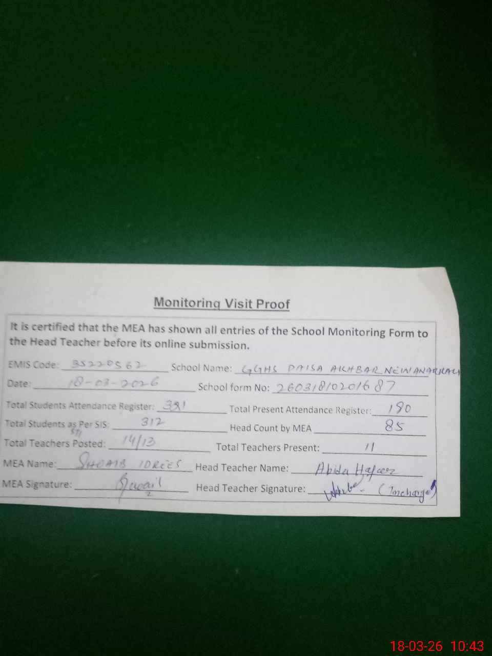 | Remarks (Use Separate Page if Required): 1. M Shakir Sabir Chowkidar has been absent from duty since 01 Feb, 2026. 2. Seven classrooms has been declared dangerous locally 3. Wooden doors of two classrooms are broken 4. Classes ECE, Nursery, one , two and four are on exam off 5 Head teacher named tayyaba yaqub on causal leave as per attendance register but sectioned leave not available on soft or hard copy so marked her absent 6 FTF Account record not maintained properly | |||||
