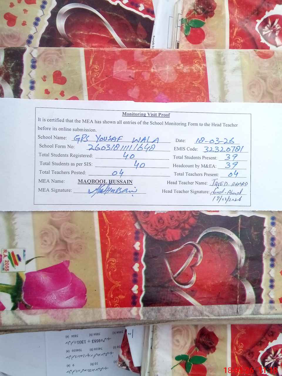 | EMIS Code: 32320781 | Name of School: GPS YOUSUF WALA | |||