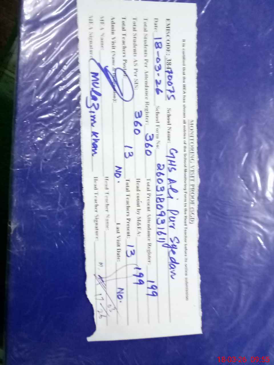| Attendance Register | Head Teacher | MEA with School | Visit Proof |