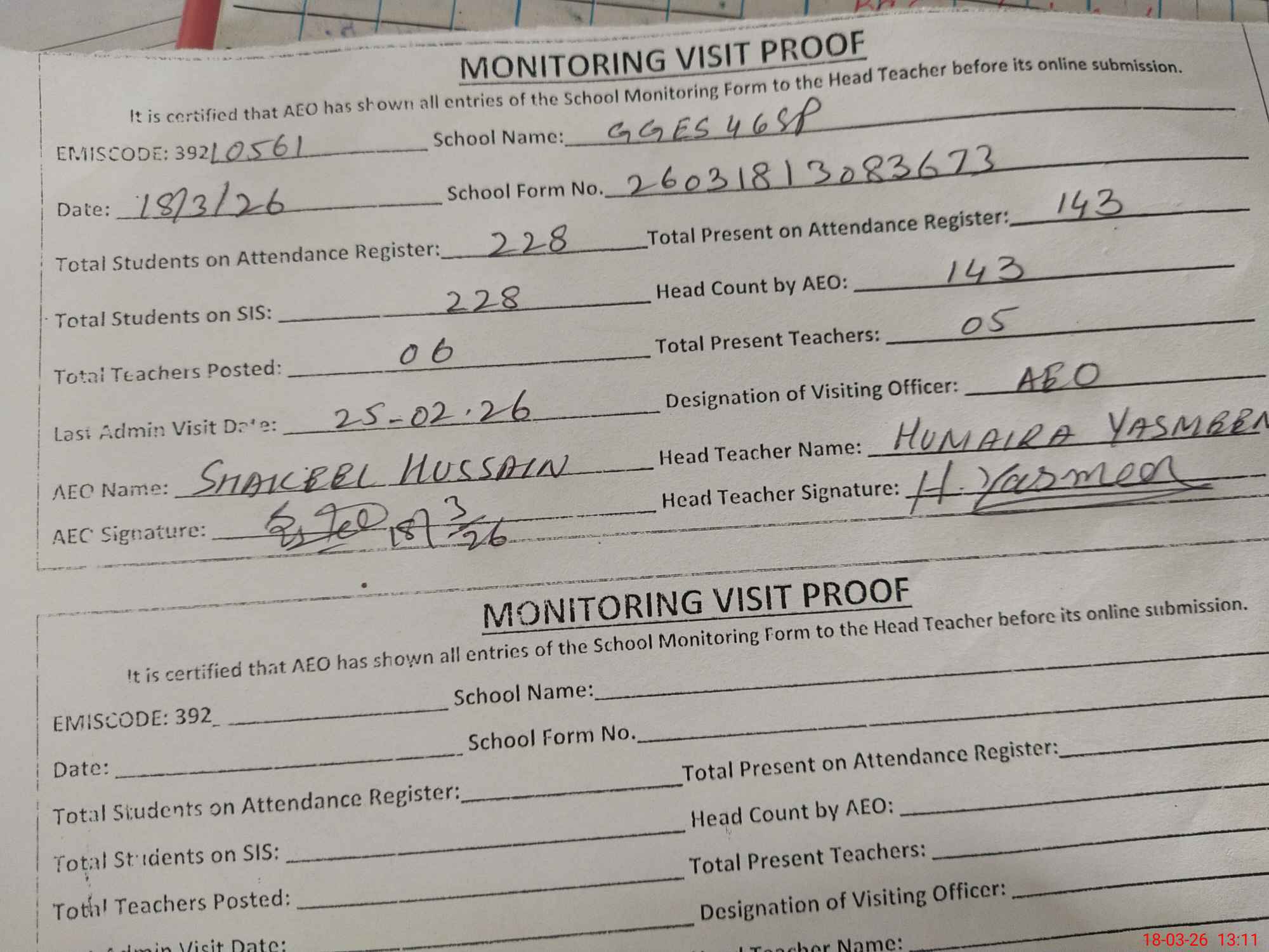 | Attendance Register | Head Teacher | MEA with School | Visit Proof |