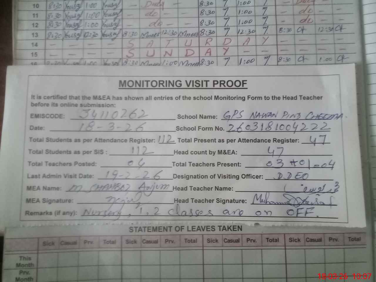| Attendance Register | Head Teacher | MEA with School | Visit Proof |