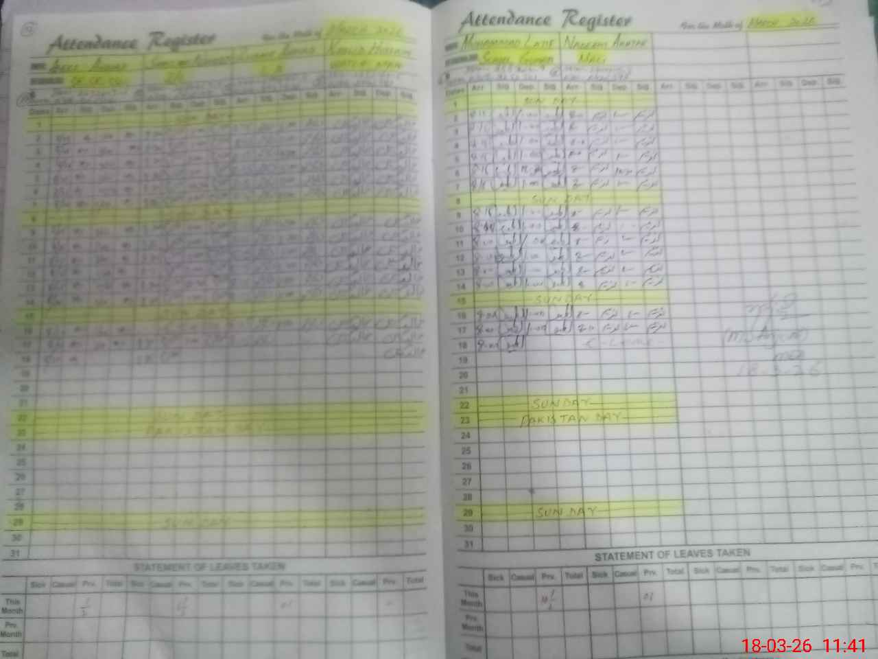 | CNIC | Full Name | Designation | R/C | Absence During Last Calender Month |